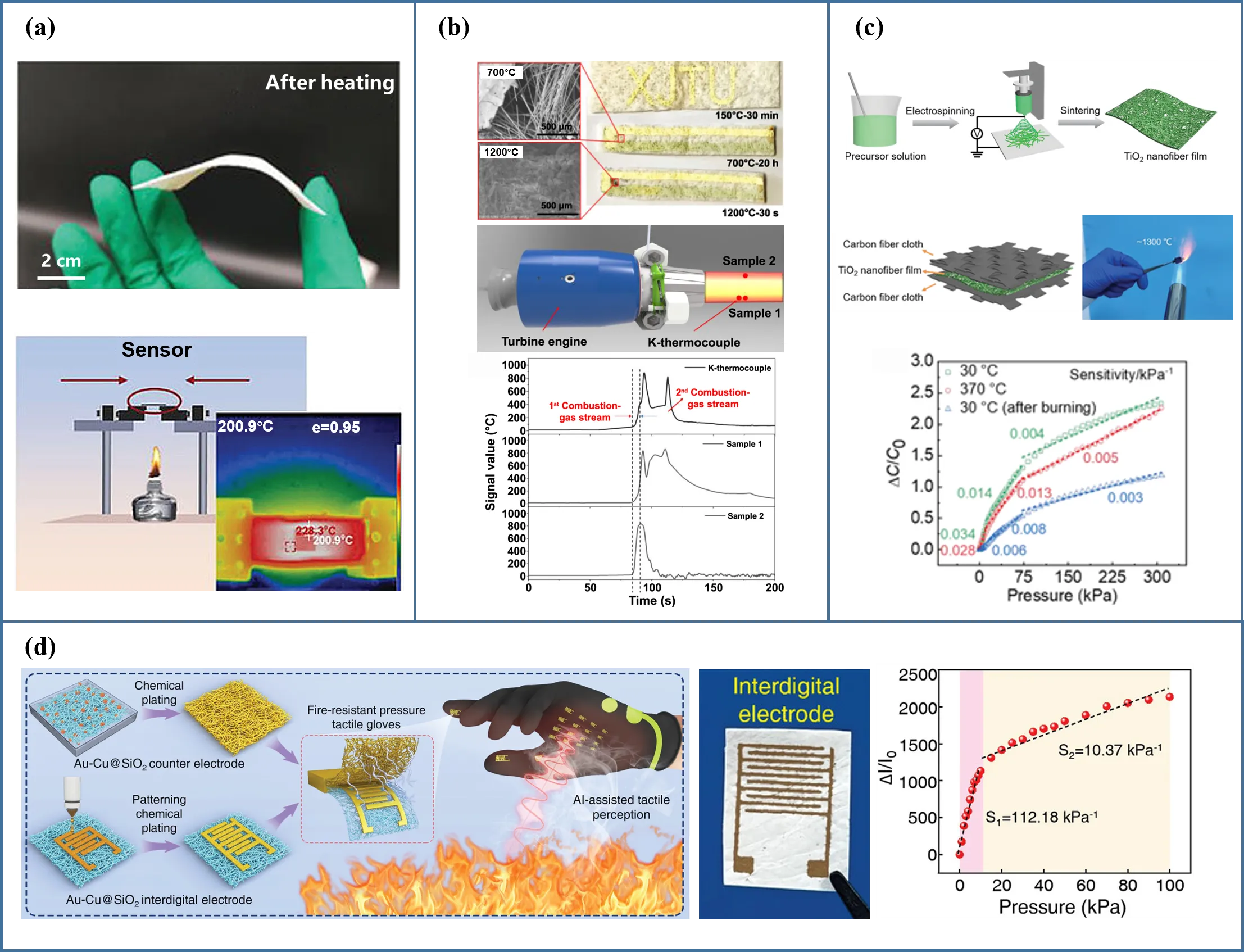 2) were applied in flexible sensors capable of recognizing human body parts and measuring pressure under temperatures up to 600 °C, with transient operation possible at 1300 °C.