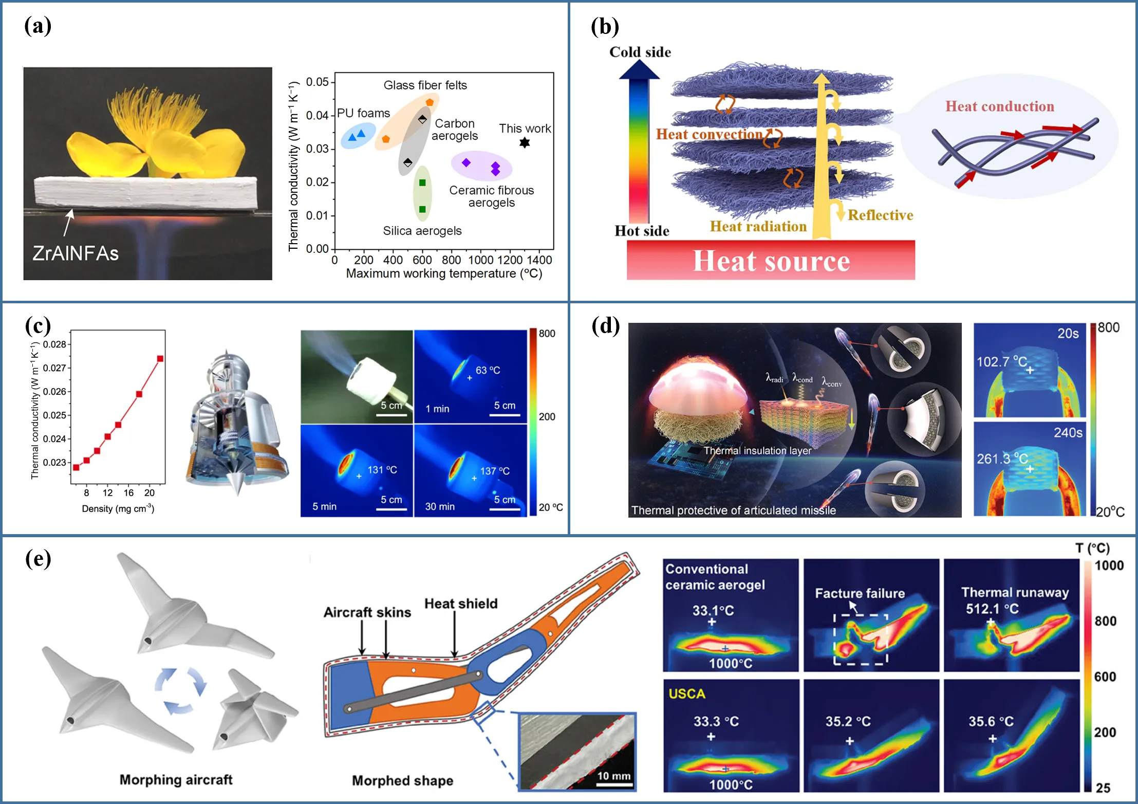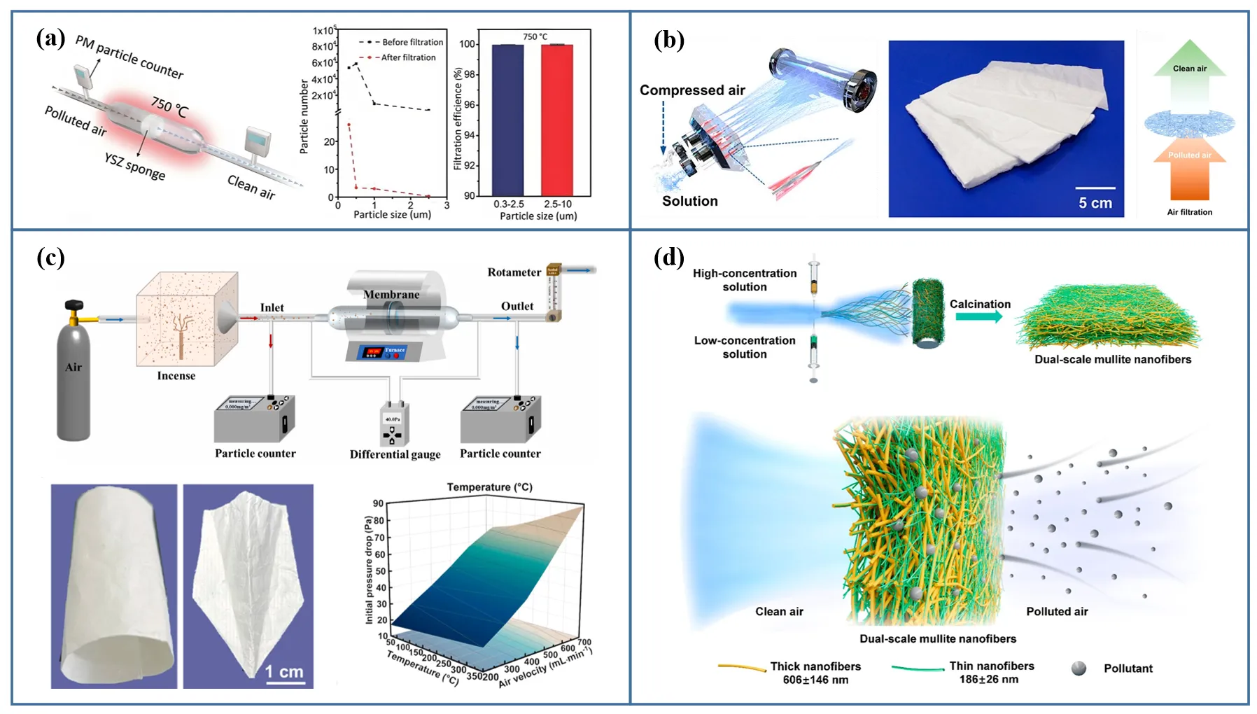 The review of FCFs highlights their significant potential in high-temperature applications across various fields, including thermal insulation, flue gas filtration, catalysis, electromagnetic wave absorption, energy devices, and sensing. The unique combination of thermal stability, mechanical flexibility, and chemical resistance makes FCFs ideal for addressing the challenges posed by extreme environments. The recent advances in material science and engineering have enabled the development of multifunctional FCFs, which not only maintain their structural integrity at high temperatures but also exhibit enhanced properties such as electromagnetic wave absorption, ion transmission, and flexible sensing.