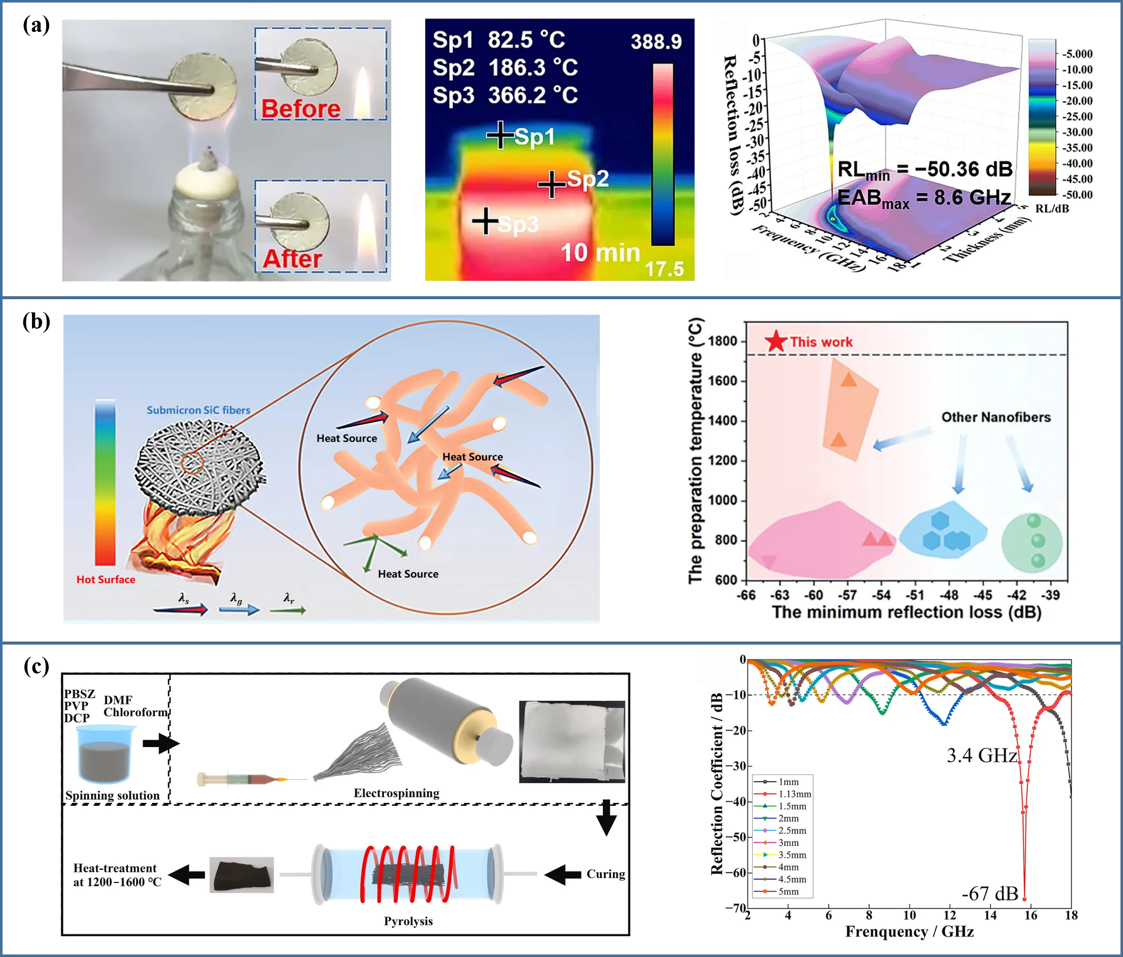 97] fabricated submicron SiC fibers via electrospinning and high-temperature sintering, achieving a reflection loss of −63.34 dB at 12.85 GHz with a thickness of 1.7 mm (