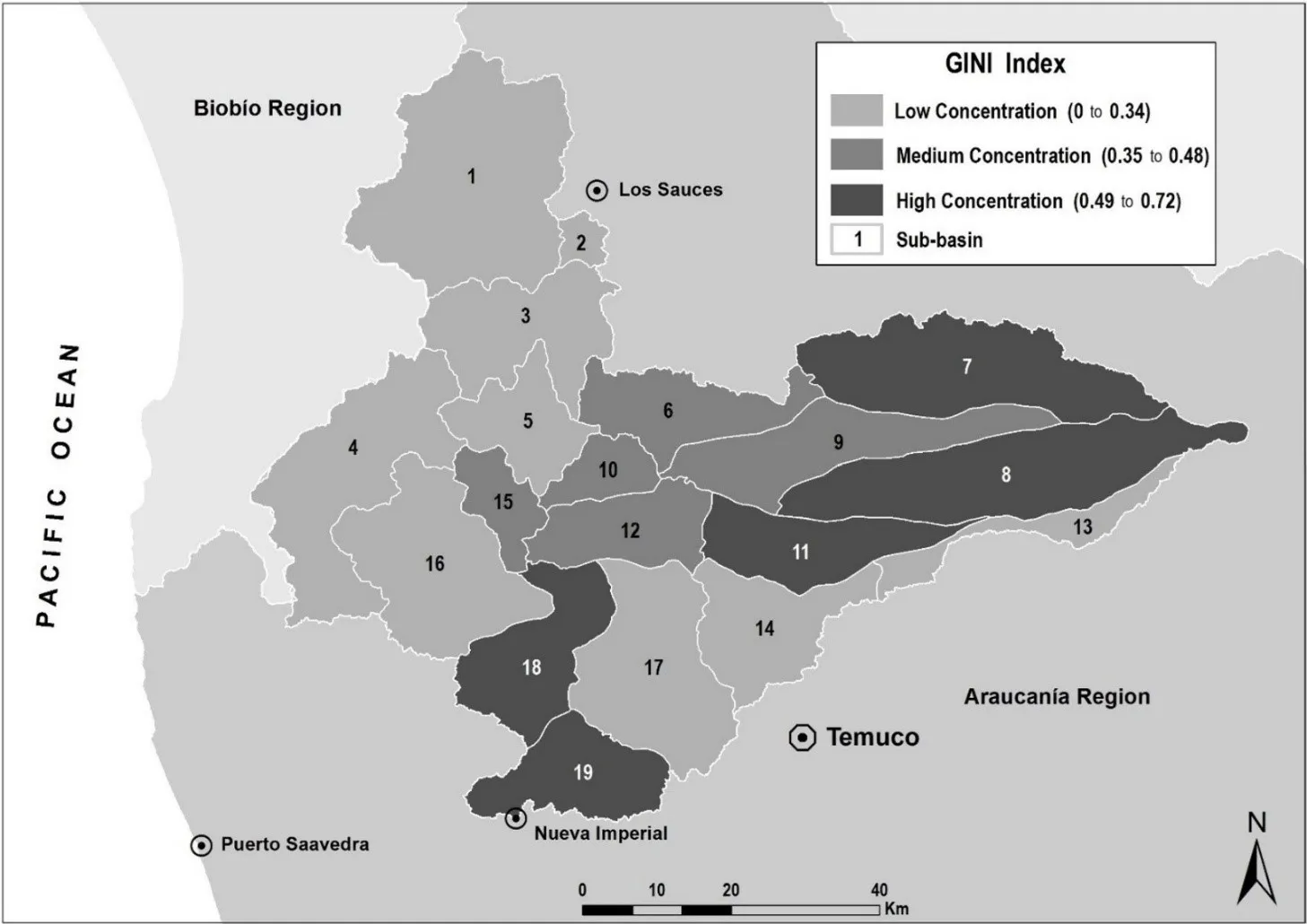 42] for the 2001–2015 period. Information on flows and petitioners by sub-basin was used to develop a GINI index.