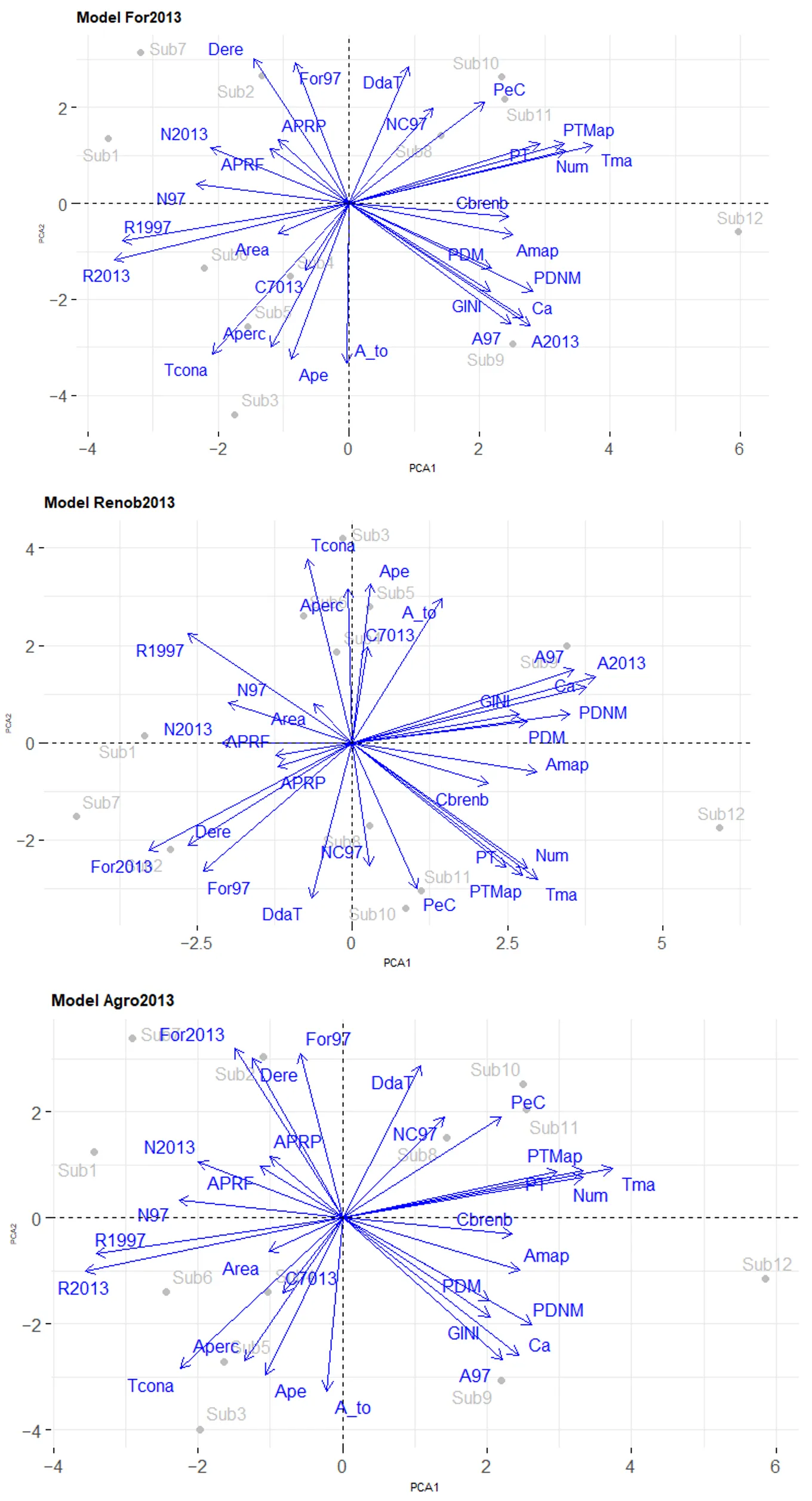 46]. ArcGis 10.1 was used to process the digital coverages and create thematic maps showing the spatial behavior of the analyzed variables. For the statistical analysis, a multi-variate data matrix was constructed, where each row corresponds to a sub-basin (i), and each column shows the value of the variable (). This matrix was the basis for the principal component analysis (PCA).