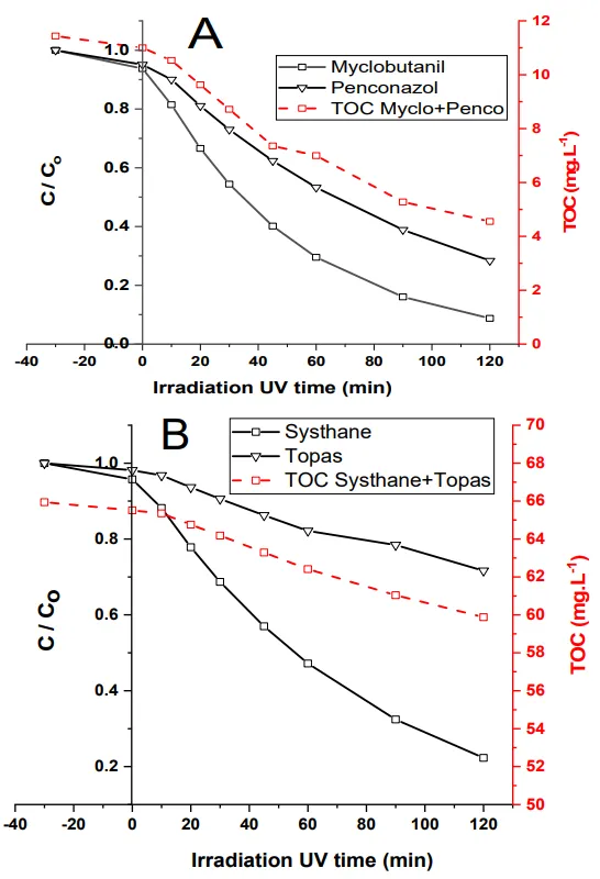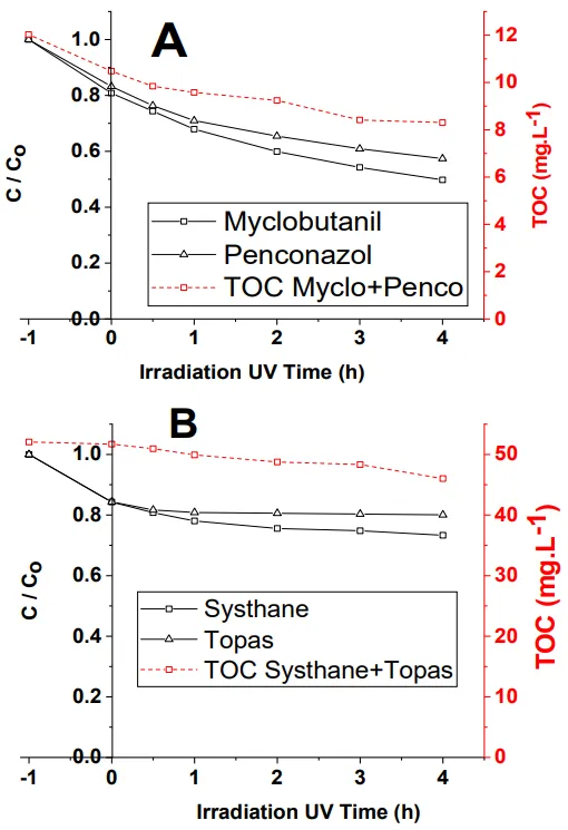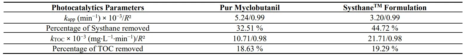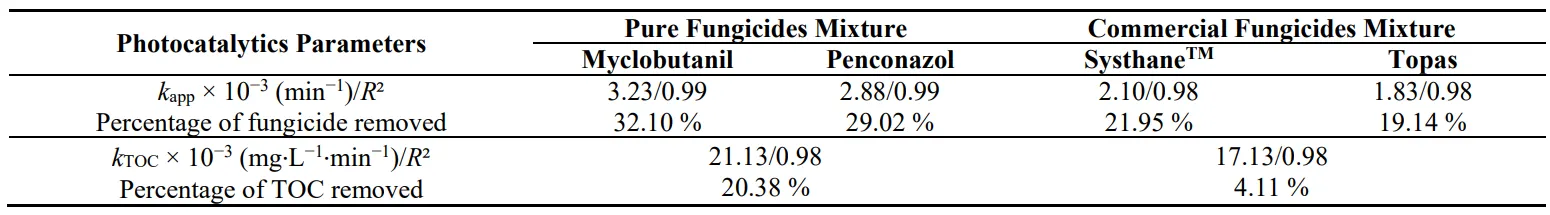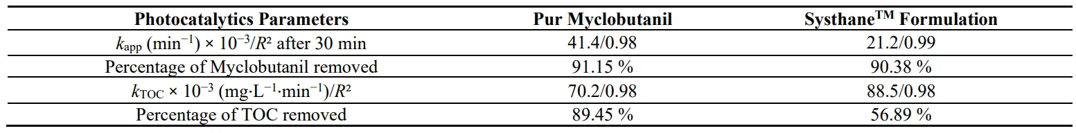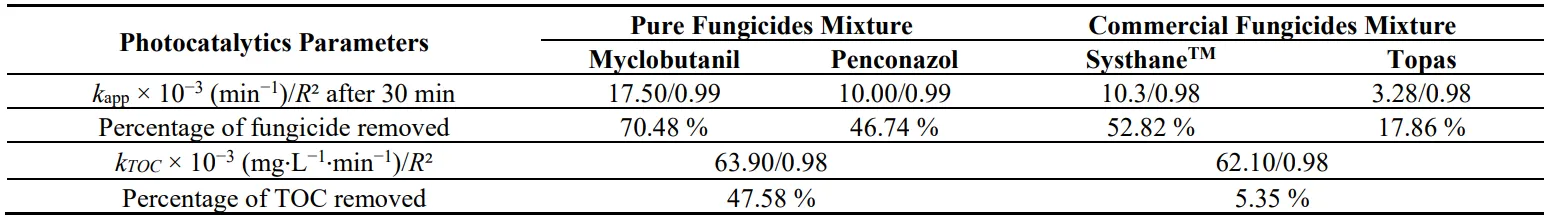 Table 6. Removal rates of Myclobutanil/Penconazol and TOC, in a mixture of pure fungicide solution and of Systhane and Topas commercial formulations, in recirculation mode by TiO2/β-SiC over 60 min of UV-A irradiation.