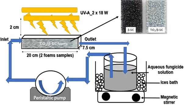 . Experimental photocatalytic device with TiO2/β-SiC.
