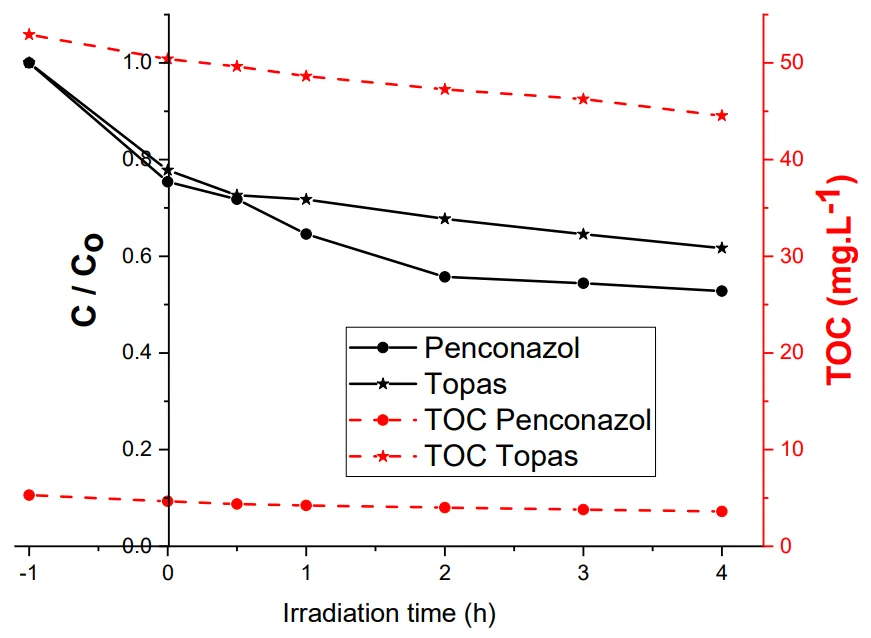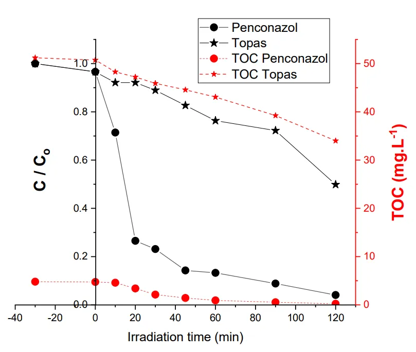 2 P25 in suspension. shows the fungicide disappearance, as well as TOC variation as a function of irradiation time. According to , the apparent rate constant of Penconazol disappearance