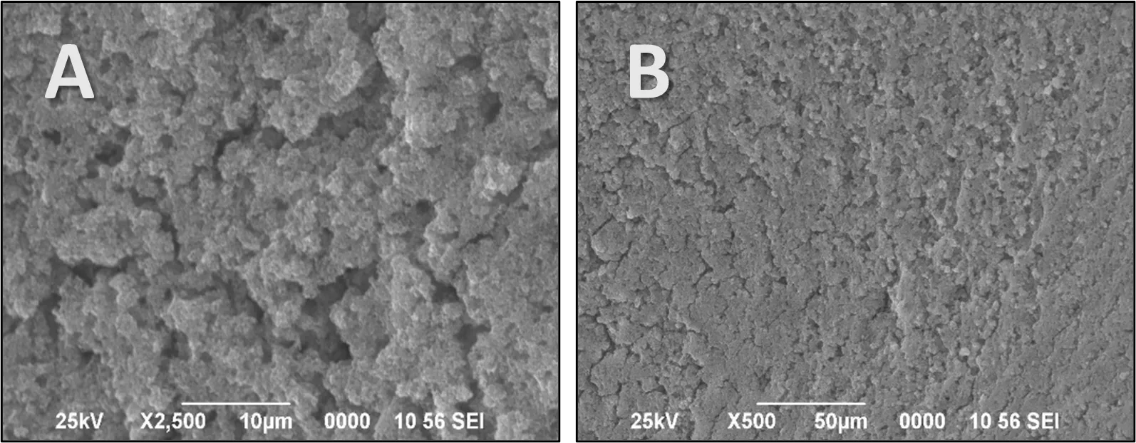 19] shows cracks at the surface of the material. This is due to drying the material at room temperature (dip-coating phase) or to the calcination phase at 450 °C, because thermal expansion coefficients of the support and the catalyst are different. However, in the presence of TTIP, the surface is more homogeneous (B), showing that the addition of TTIP to the TiO