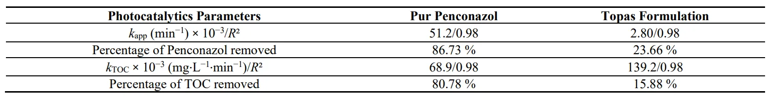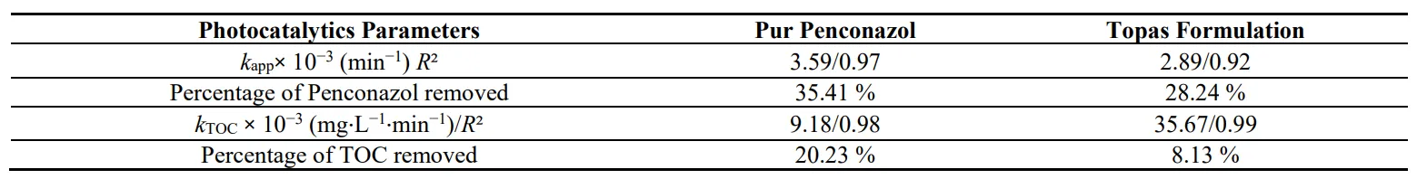 kTop) of Topas solution. After one-hour treatment, 86.74% of Penconazol are eliminated in the pure molecule solution whereas only 23.66% of the fungicide is removed from the commercial Topas formulation. Remember that Penconazol represents approximately 10.20% by mass of Topas solution, the remaining 89.80% comprising cyclohexanone and 2-methylpropanol. During the treatment, OH free radicals responsible for the molecular degradation, attack both Penconazol molecules and the additives. These additives compete on the active sites of the TiO