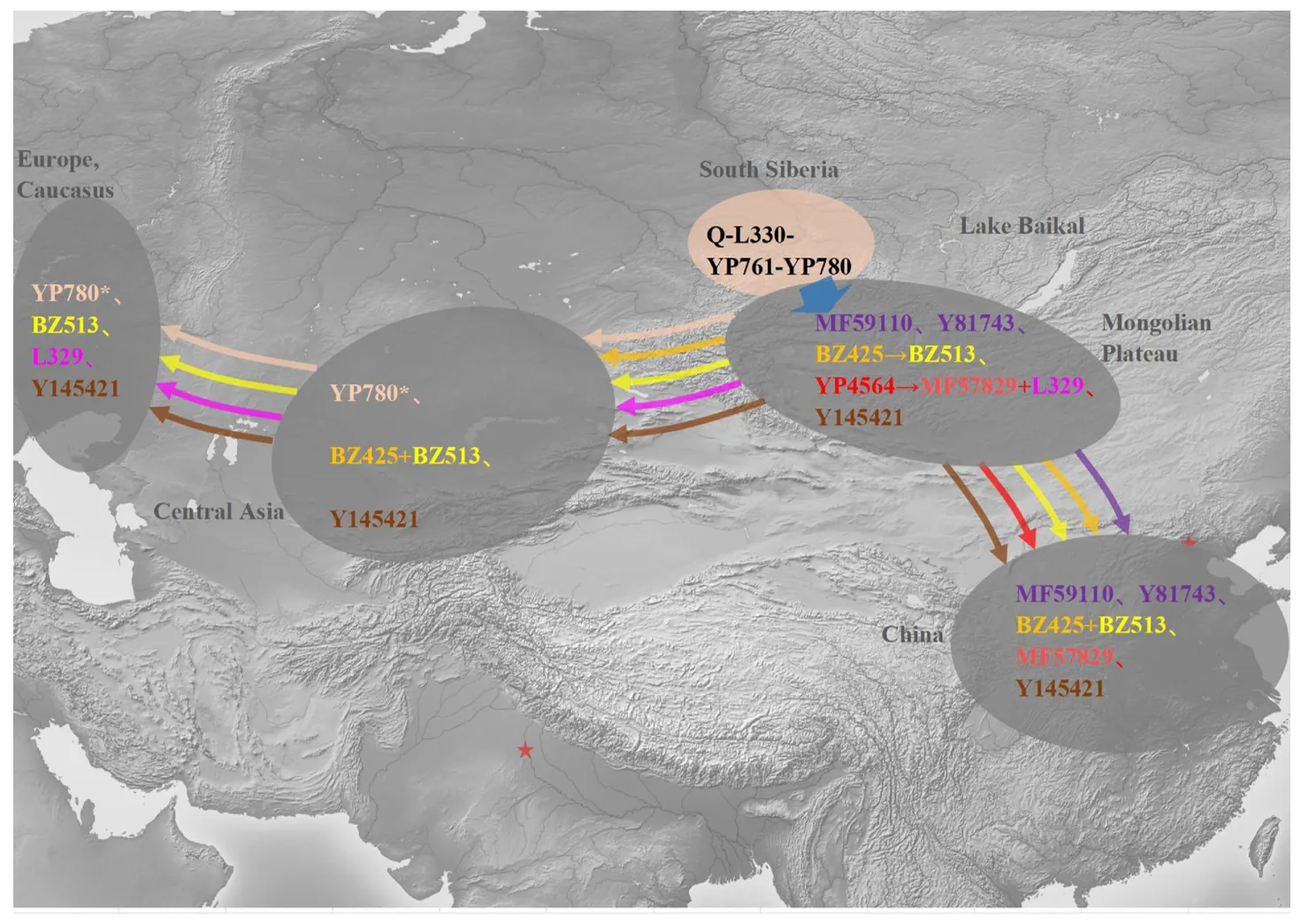 Figure 3. Schematic diagram of the possible diffusion routes of major sub-branches of Q-L330-YP761. The figure shows the inferred migration routes of Q-L330-YP761 downstream lineages. Different colored arrows indicate possible migration routes of different lineages. To facilitate the identification of the spatial distribution of samples, we have marked the locations of Beijing and Delhi with red five-pointed stars and labeled some important geographical regions in grey text. In the figure, all haplotypes located within the same gray ellipse as YP780∗ are sub-lineages of YP780. Thus, YP780∗ denotes YP780 haplogroups excluding those in the grey ellipse.