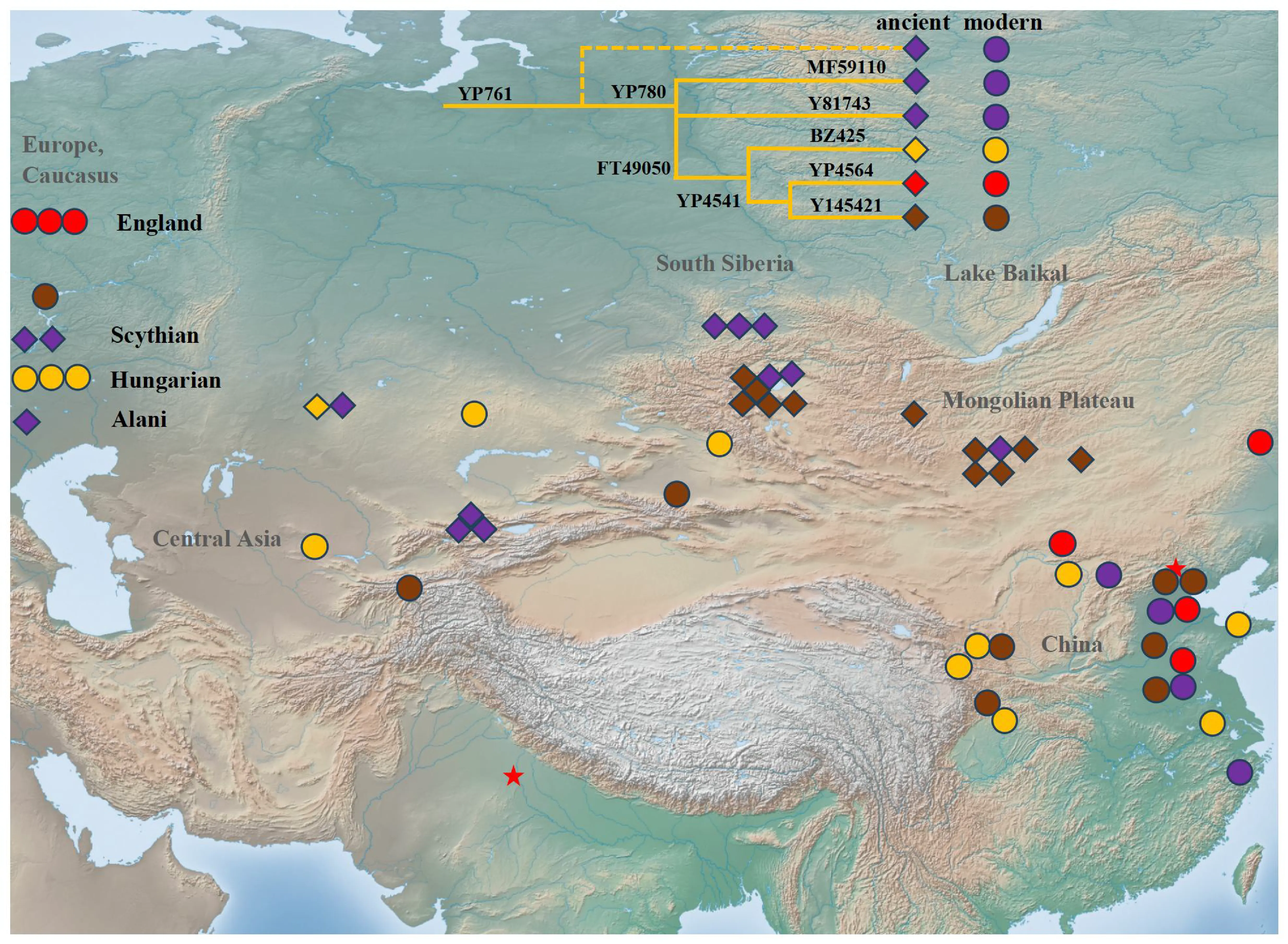 . Schematic diagram of the location of Q-L330-YP761 individuals and the possible diffusion routes of major sub-branches. This legend illustrates a simplified paternal lineage tree of Q-L330-YP761, with distinct downstream lineages differentiated by color. Ancient samples are represented by diamonds, and modern samples by circles. To facilitate the identification of the spatial distribution of samples, we have marked the locations of Beijing and Delhi with red five-pointed stars and labeled some important geographical regions in grey text. The map includes most samples to show their distribution across Eurasia clearly. However, four groups lie outside the map’s range. They are labeled at its edge: three modern British individuals, three modern Hungarians, two ancient Scythian Culture individuals from Ukraine, and one Alan individual from Kyrgyzstan. Detailed information on all samples is provided in Supplementary Table S1.