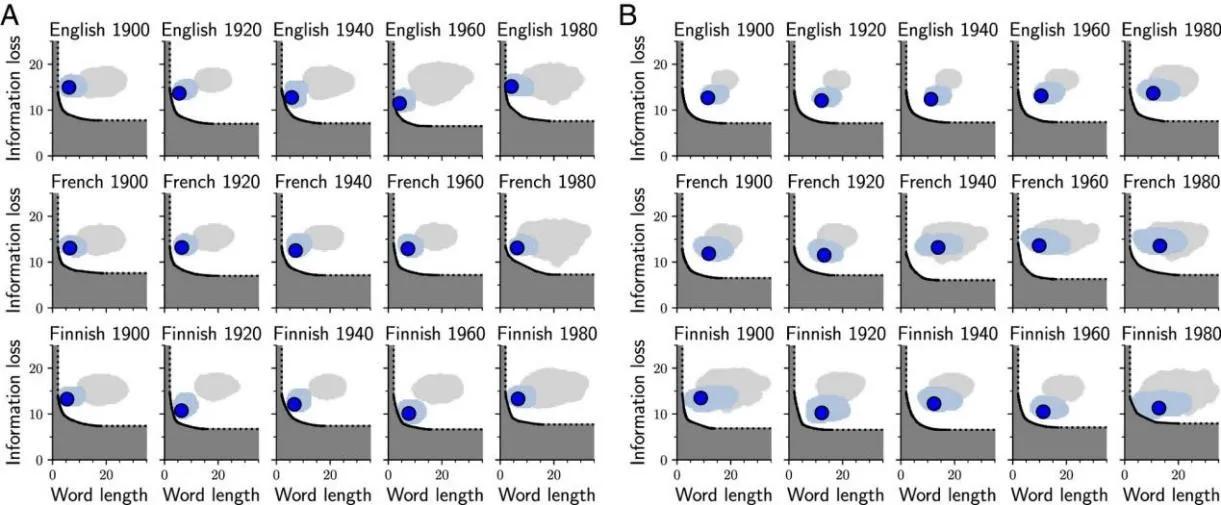 . Efficiency analyses of word reuse and compounding Panels (<b>A</b>,<b>B</b>) illustrate the word reuse and compounding results, respectively. The black curve represents the Pareto frontier, while the blue, light blue and gray areas correspond to attested items, near-synonyms, and random words, respectively. This graphic is from [