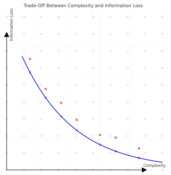 Employing these measures, the efficiency of attested linguistic structures can be quantified and mapped onto a two-dimensional space that captures the trade-off between complexity and information loss. Efficient linguistic systems are expected to fall near or on the Pareto frontier, which represents the set of optimal trade-offs where reducing complexity inevitably leads to increased information loss, and decreasing information loss necessarily requires higher complexity. The trade-off can be illustrated in