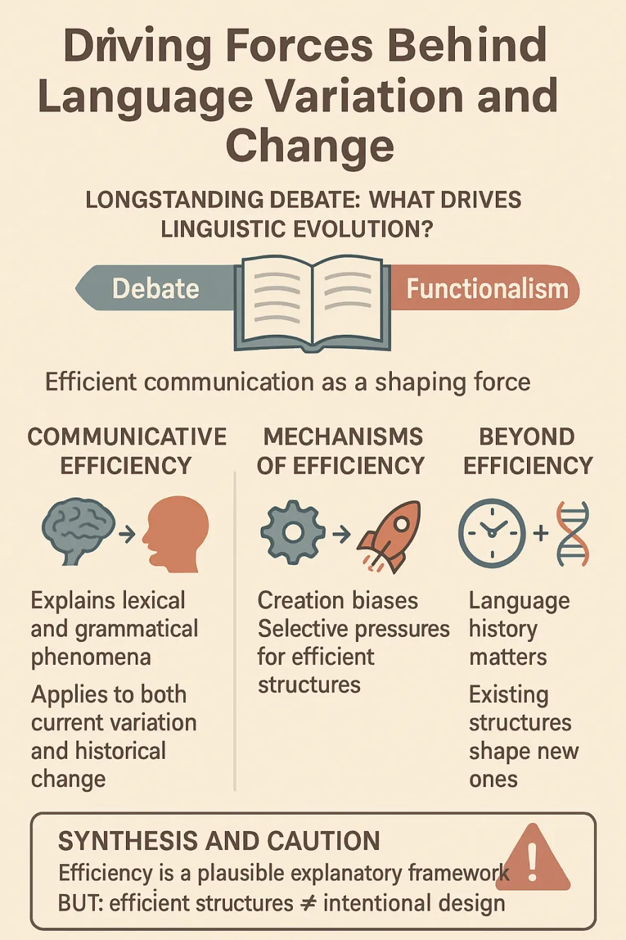 22]. Moreover, another study, which tested the functionalist account against null models, presents a mixed picture: some linguistic changes are driven by stochastic processes, while others do not occur by chance, indicating that selective pressures for efficient communication are likely at play in certain linguistic phenomena [