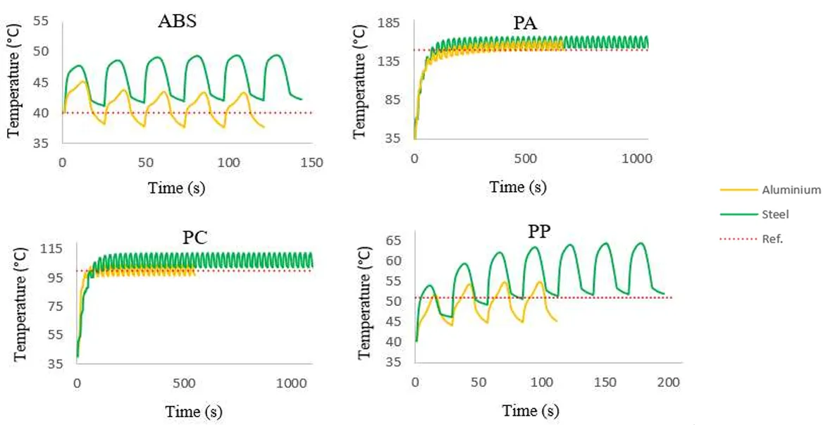In this work, statistical methods are applied to the numerical simulations’ results for the identification of the processing parameters of different polymers (amorphous and semicrystalline) to assess the performance of different mould materials (steel and aluminium). This work aims to evaluate the feasibility of mould injecting such polymers in those mould’s materials, in terms of production time and quality of the moulded part. The numerical simulations were performed with the software MoldFlow 2024