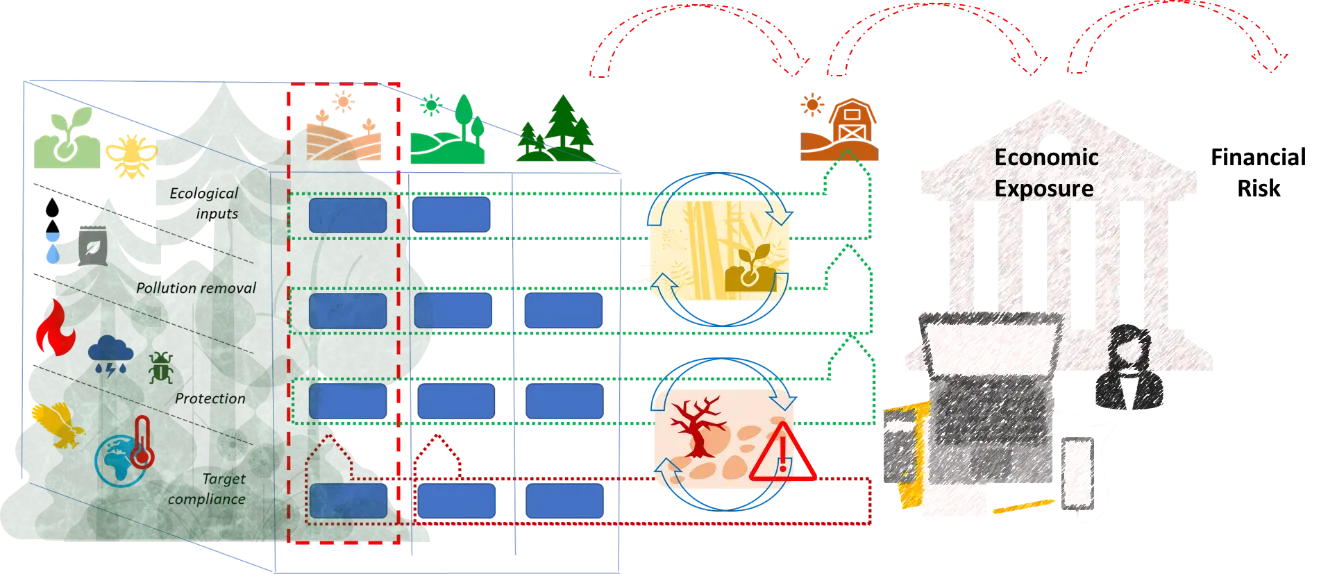 . The missing steps for a complete cause-and-effect relationship. The red dotted arrow shows that the link between ecosystem services (flows or vulnerabilities) and the agricultural sector is just the beginning of a series of connections that need to be investigated. These connections will reveal the impacts and dependencies with the real economy, which quantifies economic exposure, and the financial sectors, which quantify financial risk.