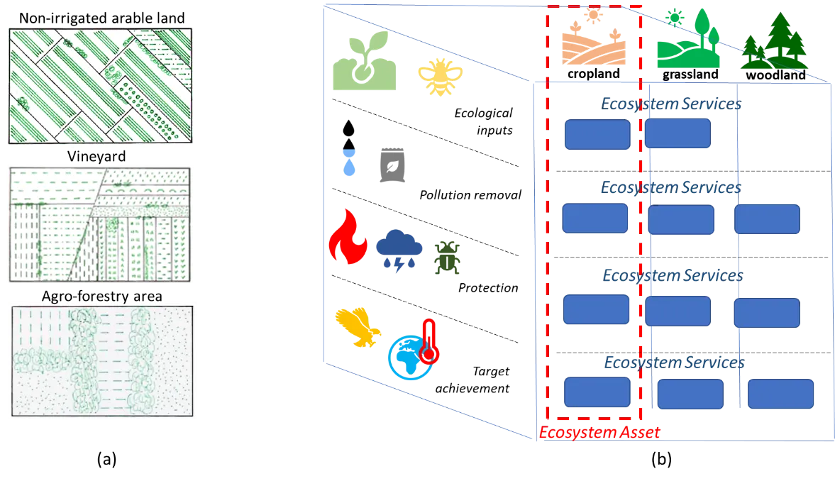 . From the concept of land use (<b>a</b>) to the concept of ecosystem asset (<b>b</b>).