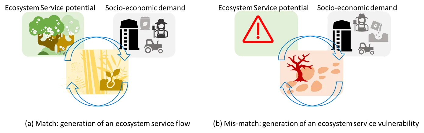 31]. When there is a match between ecosystem potential and socio-economic demand, then an ecosystem service is effectively delivered (a). However, there may be cases when there is a mismatch because ecosystems are not present or because they are too degraded to provide the needed service flow (b).