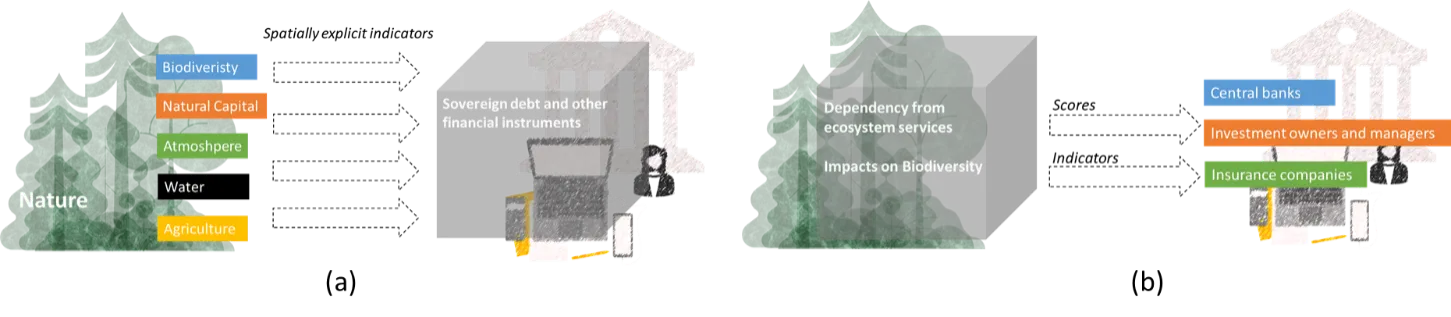 17], assigns a score on the dependencies on 21 ecosystem services for 86 business processes, which are then linked to economic sectors; eventually, bank credit exposures to those sectors are estimated. Such estimates help assess banks’ exposure to sectors that are highly or very highly dependent on one or more ecosystem services. However, the scores simply assume that ecosystems are able to provide all the services needed, which is quite a strong assumption. Second on the impact side, selected indicators (such as the biodiversity footprint, the loss of species and populations in ecosystems or the companies that operate in protected areas and are involved in environmentally controversial activities) can provide insight on the impact of economic activities on biodiversity.