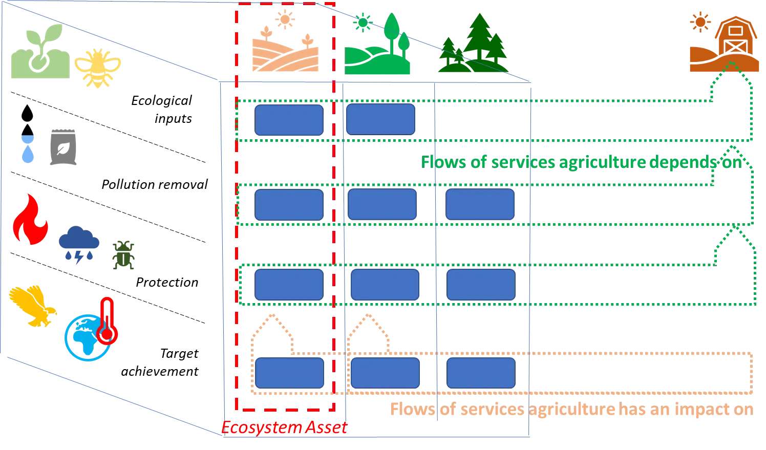 A comprehensive framework cannot treat climate change, biodiversity, natural resources, pollution, and ecosystem services as separate and disconnected issues. Within a comprehensive framework, all these environmental issues should be part of the same “ecosystem asset”. The definition of “ecosystem asset” should capture all the dependencies and impacts that economic activities (and this explains why it is named “asset”) exercise on nature (and this explains why the specification is “ecosystem”). Dependencies and impacts can be identified, described and measured through a series of Ecosystem Services (ES), which represent the contribution of ecosystems to human activities and therefore the bridge capable of disentangling the complexity of the ecological domain into individual flows that fulfil specific uses for specific beneficiaries in the socio-economic domain. ES in fact supports economic activities in different ways [