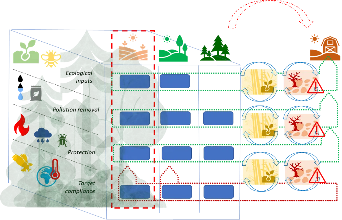 . Ecosystem services: matching and mismatching in transactions between ecosystems and socio-economic systems. The red dotted arrow shows the link between ecosystem services (flows or vulnerabilities) and the agricultural sector.