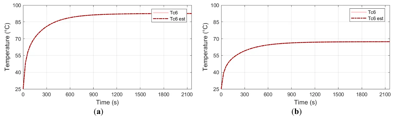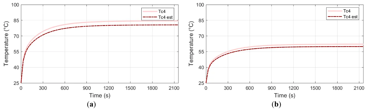 Figure 12. Comparison between the actual temperature of PV connector # 4 and the estimated temperature of MME, (<b>a</b>) 5 W heating power; (<b>b</b>) 3 W heating power.