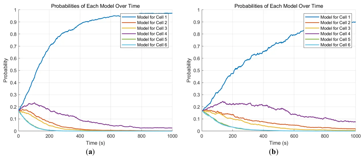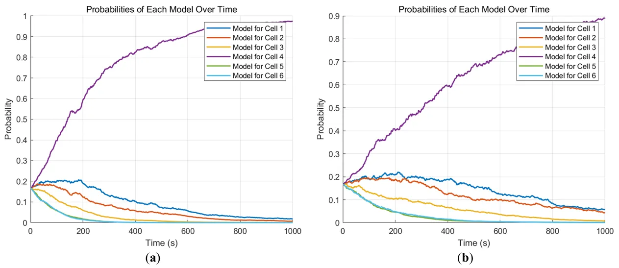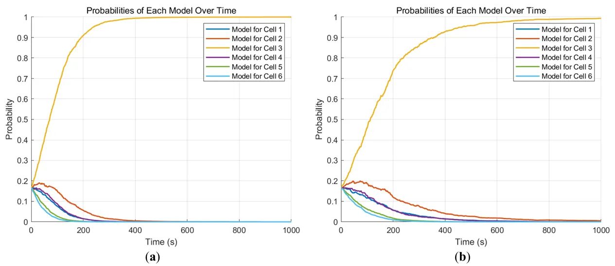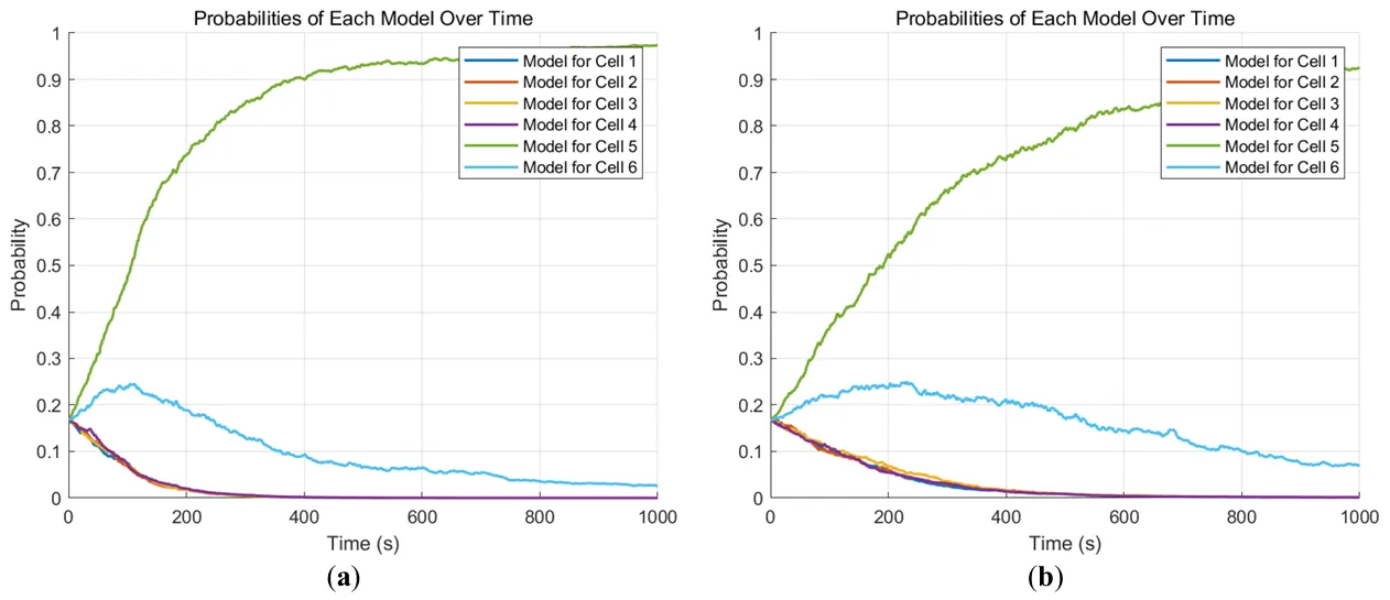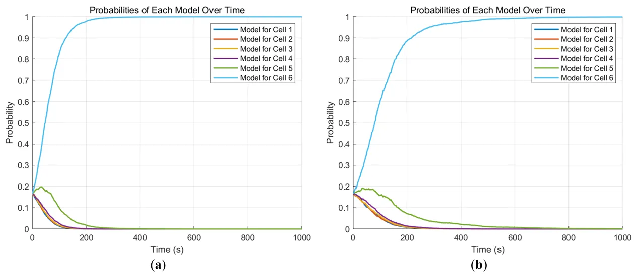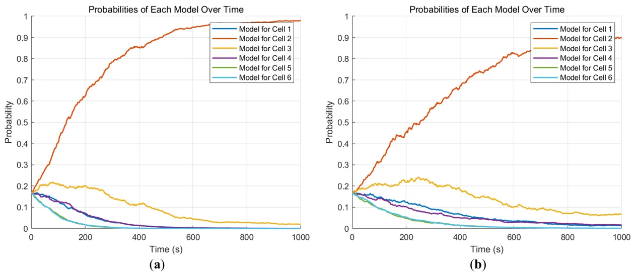 . Probability of the six augmented models when the PV connector # 2 is abnormally overheated, (<b>a</b>) 5 W heating power; (<b>b</b>) 3 W heating power.