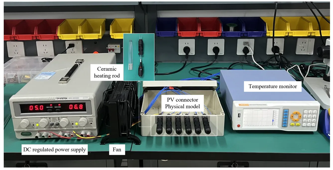 The experimental system consists of a DC power supply, a temperature monitor, and six PV connectors arranged at equal distances. Ceramic heating rods are used to simulate abnormal heating.