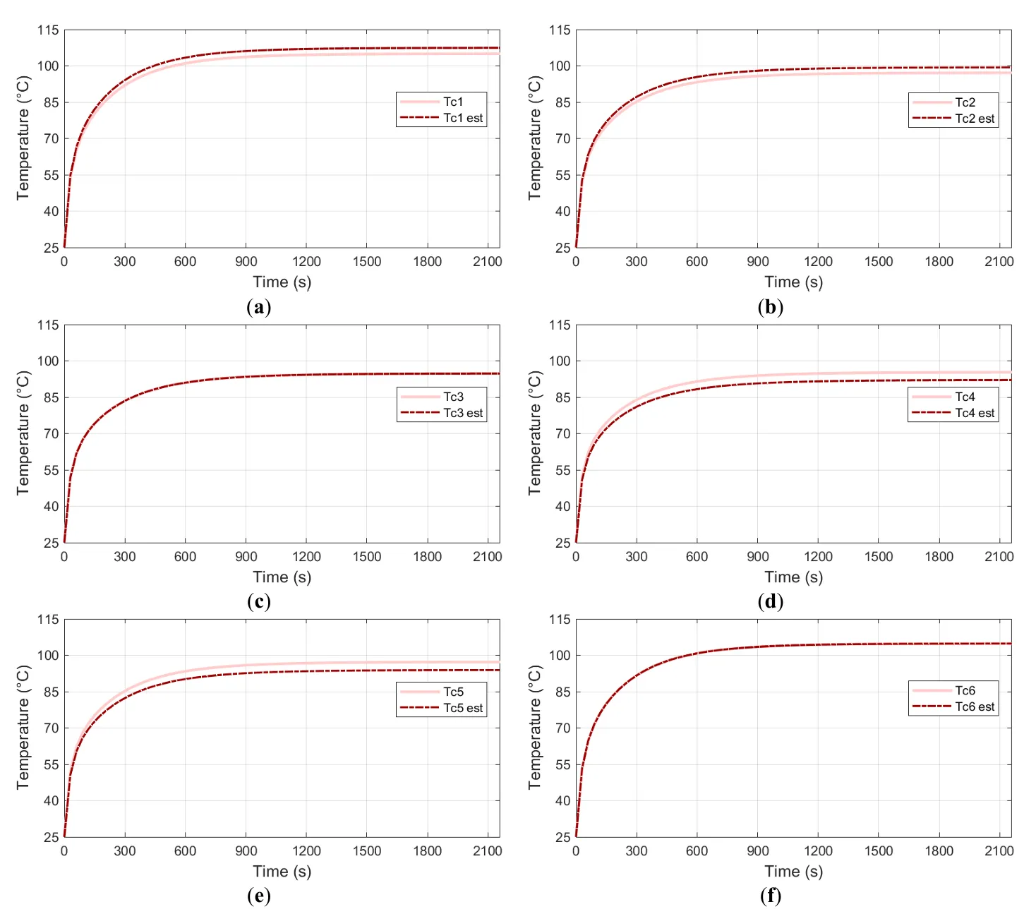 Combined with the analysis of simulation results, the measured temperature data of #3 and #6 temperature sensors show a high trend. This bias may result from idealized assumptions of the model, such as the assumption that the temperature distribution of the shell and metal core is uniform during model definition, or some non-ideal factors in the experimental setup are not fully taken into account.