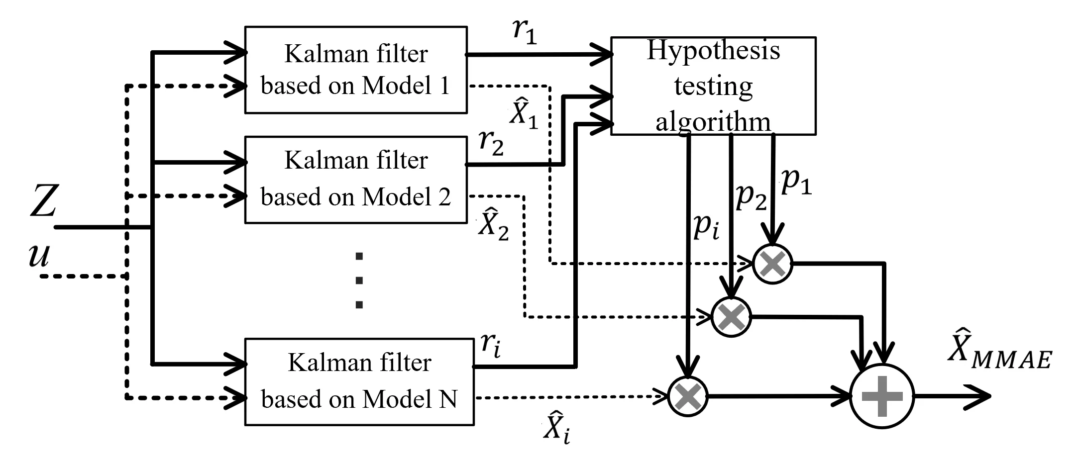 Z, the residual $$r_{i}$$ is obtained, which is used as an indicator of the degree of similarity between each filter model and the actual system model. Further, the hypothesis testing algorithm uses the residual to calculate the conditional probability $$p_{i}$$ of each Kalman filter model. Finally, it forms the mixed state estimation of the actual system through the probability-weighted average of each state estimate, so as to ensure the accuracy and robustness of the final state estimation $$\hat{X}_{M M A E}$$.