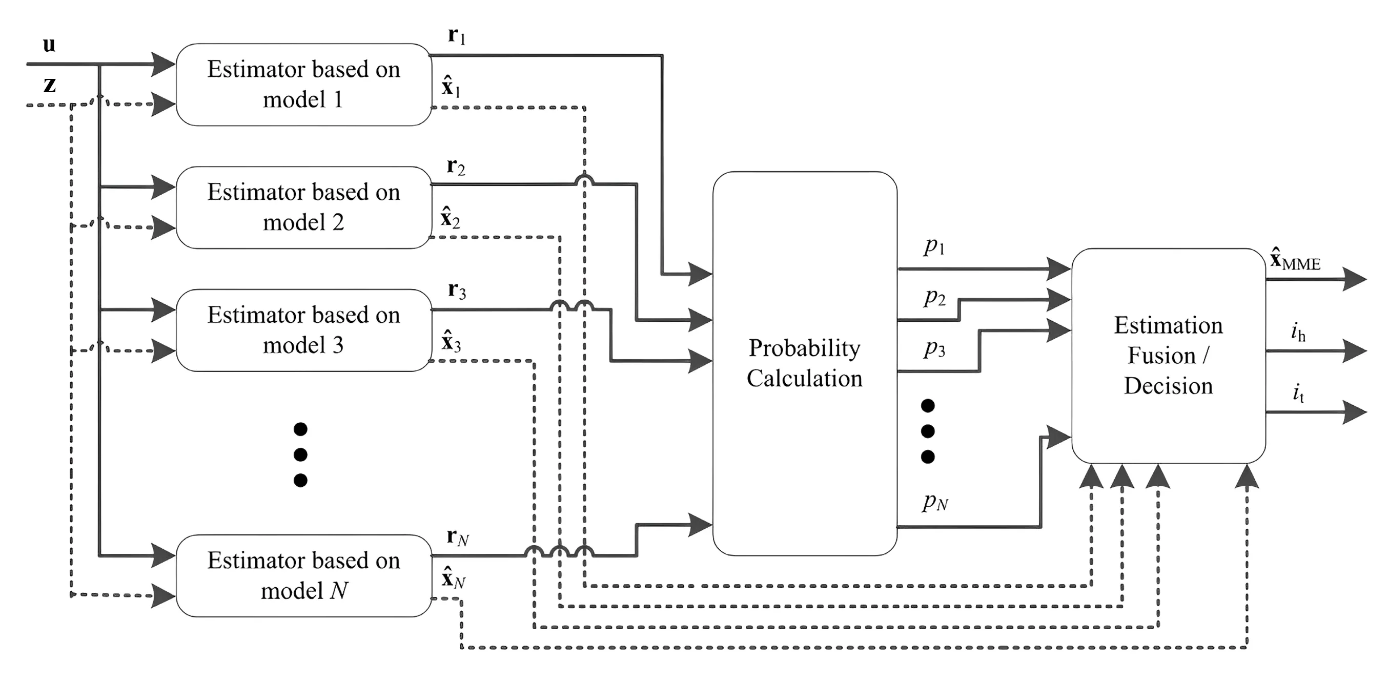 The multiple model adaptive Kalman filter is developed on the basis of the basic Kalman filter equation, which mainly includes the filter model, prediction equation, residual equation, and state update equation.