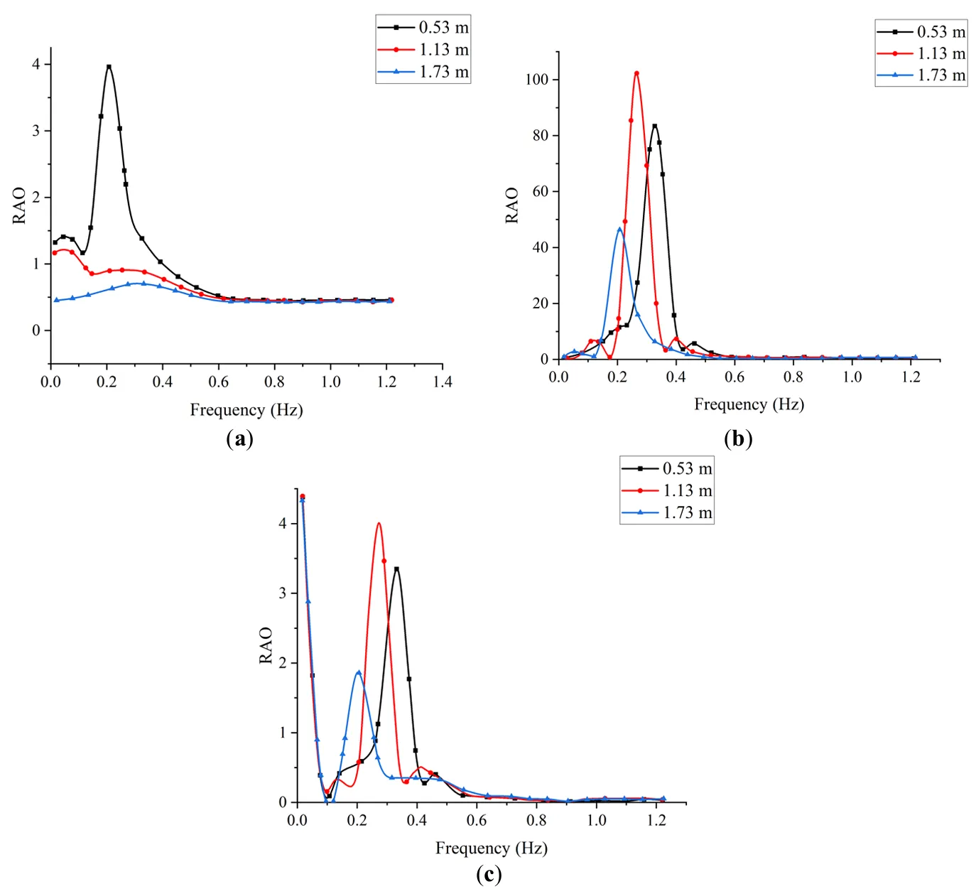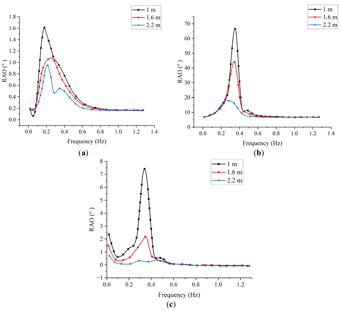 . Variations of RAO in three directions for different draft depths. (<b>a</b>) Pitch (<b>b</b>) Roll (<b>c</b>) Yaw.