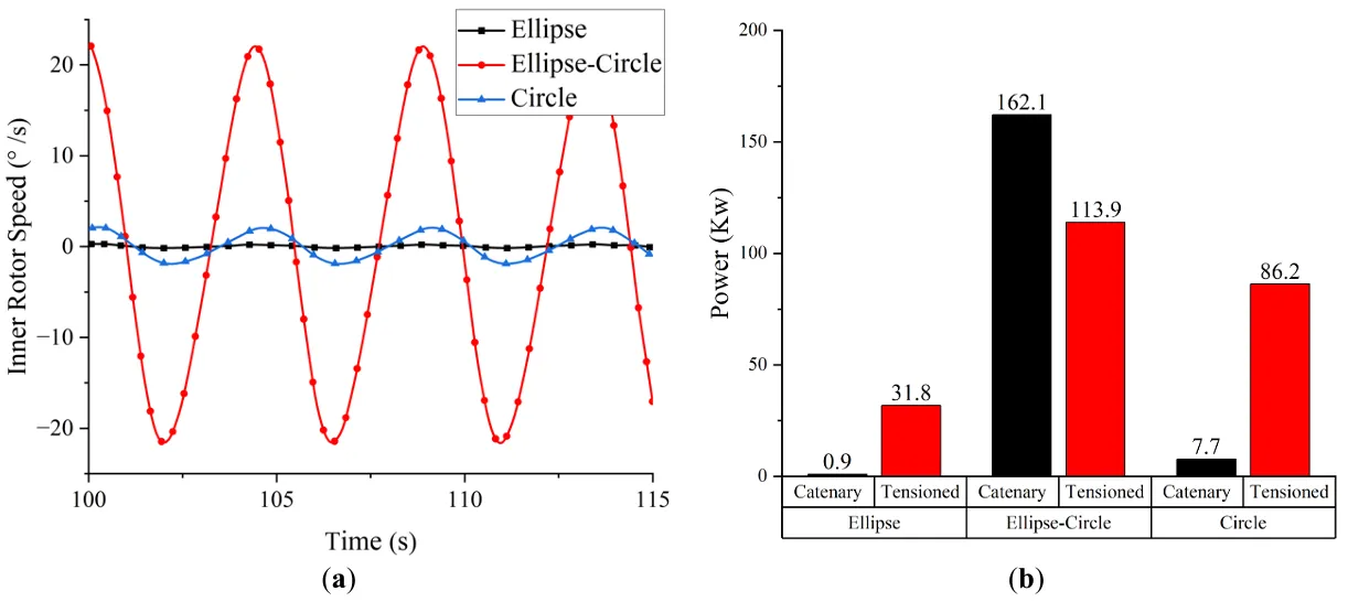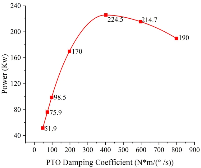 Based on the angular velocity of the inner rotor, the instantaneous power output of the device is computed. illustrates the energy capture performance under different damping conditions. The power output follows a similar non-linear trend, increasing initially with damping and then decreasing beyond a certain point. The maximum captured power, approximately 224.5 kW, occurs at a PTO damping coefficient of 400 N·m·s/(°). These results demonstrate that for a floating inner-rotor wave energy device with fixed structural parameters, there exists an optimal PTO damping value that maximizes energy capture. Identifying and applying this optimal damping is, therefore, critical to enhancing the overall efficiency and performance of the device.