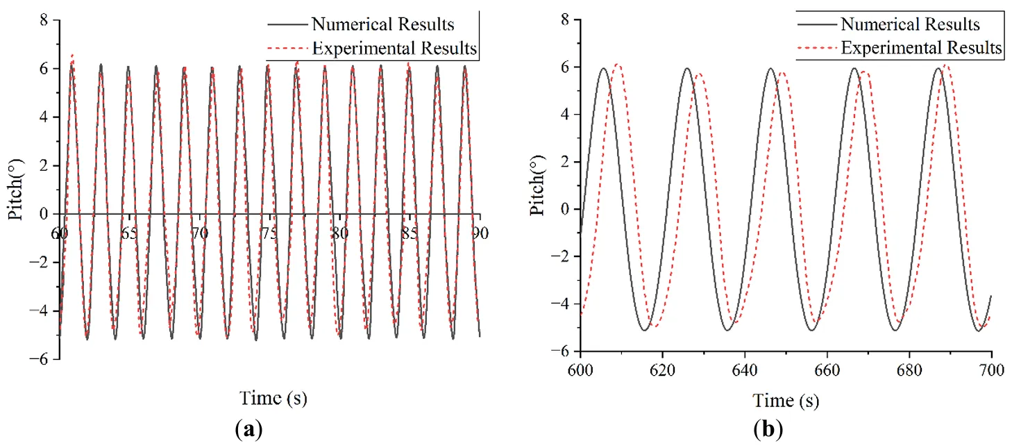 The numerical simulations were conducted using the same wave parameters as in the physical tests. To validate the numerical model, a comparison was conducted between the simulated and experimental pitch motion of the WEC under the experimental wave condition of