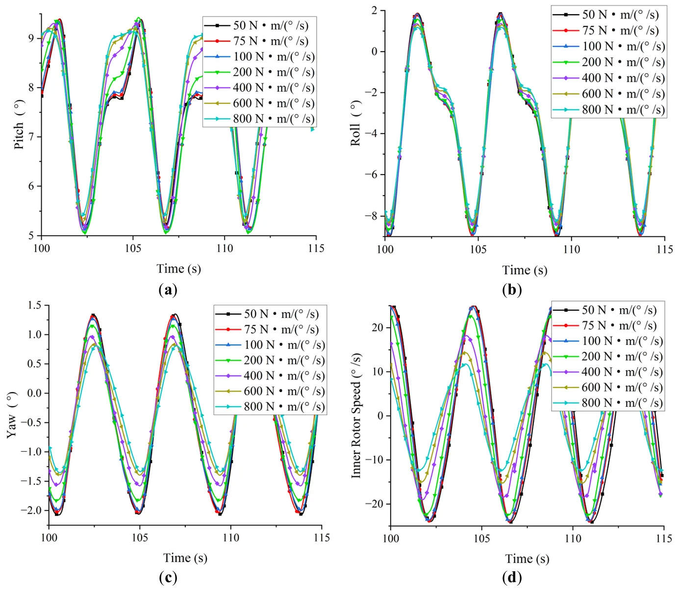 . Comparison of motion histories and inner rotor velocity for different damping coefficients. (<b>a</b>) Pitch (<b>b</b>) Roll (<b>c</b>) Yaw (<b>d</b>) Inner rotor velocity.