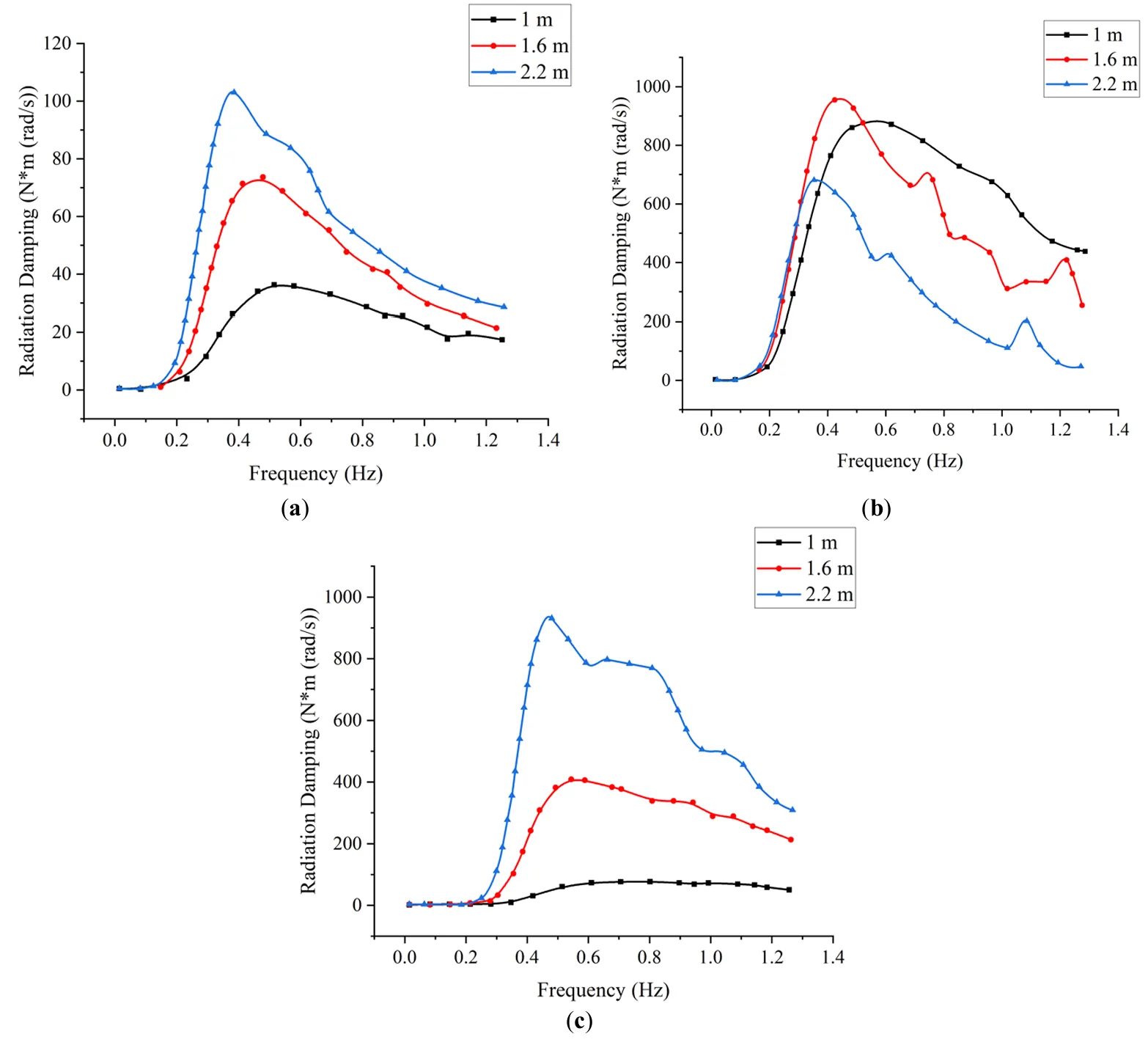 . Variations of radiation damping in three directions for different draft depths. (<b>a</b>) Pitch (<b>b</b>) Roll (<b>c</b>) Yaw.