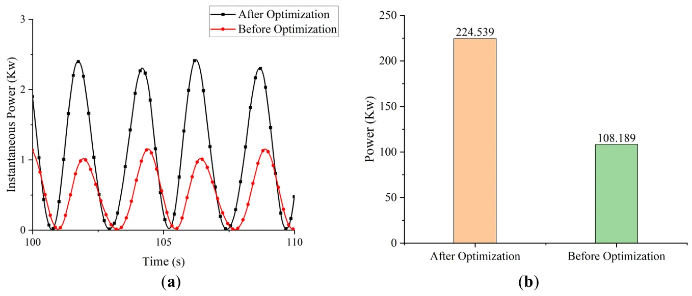 . Comparison of energy capture power before and after optimization. (<b>a</b>) Instantaneous power (<b>b</b>) Energy capture power.