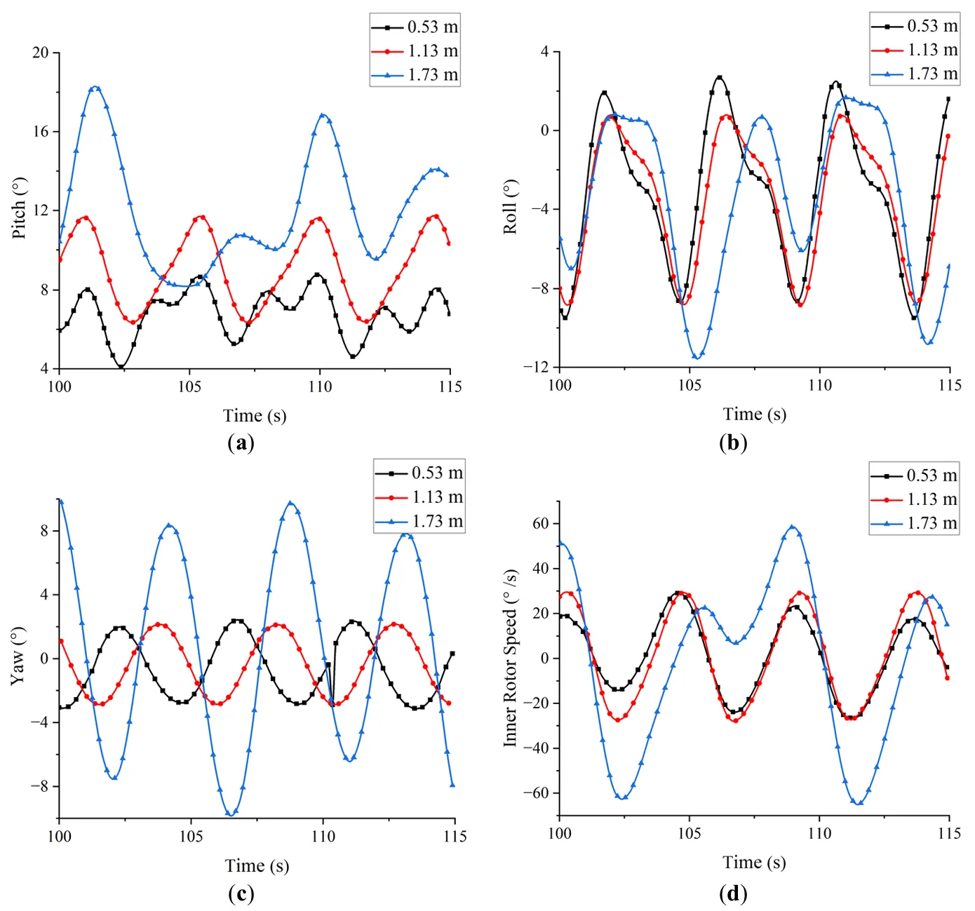 a–c shows the effect of CG position on the motion amplitudes of the device. In pitch, the motion amplitude increases with CG height, reaching approximately 10° at 1.73 m. In roll, CG position has little effect on motion, with all cases exhibiting amplitudes around 10°. In yaw, the motion amplitudes at CG heights of 0.53 m and 1.13 m are similar, while a notable increase to approximately 16° is observed at 1.73 m. d presents the variation in inner rotor angular velocity with CG position. At CG heights of 0.53 m and 1.13 m, the rotor speed amplitude remains around 55°/s, indicating minor sensitivity. However, at 1.73 m, the rotor speed increases significantly, reaching a maximum of 122°/s. This indicates a pronounced enhancement in rotational performance at higher CG positions.