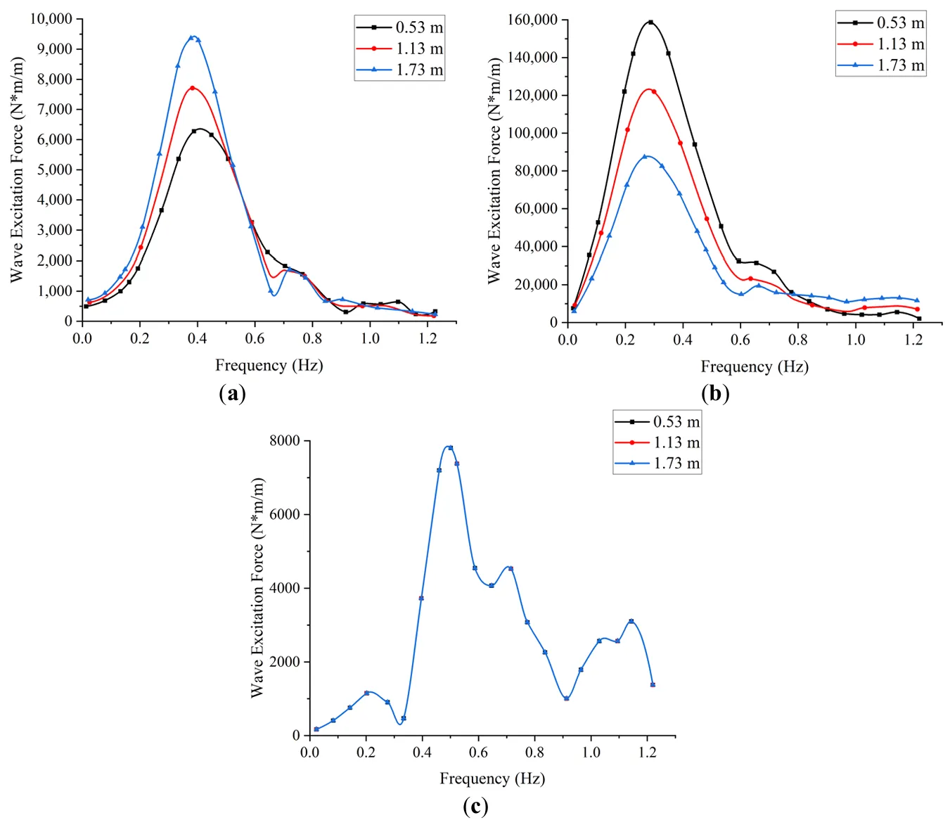 . Variations of wave excitation forces in three directions for different draft depths. (<b>a</b>) Pitch (<b>b</b>) Roll (<b>c</b>) Yaw.