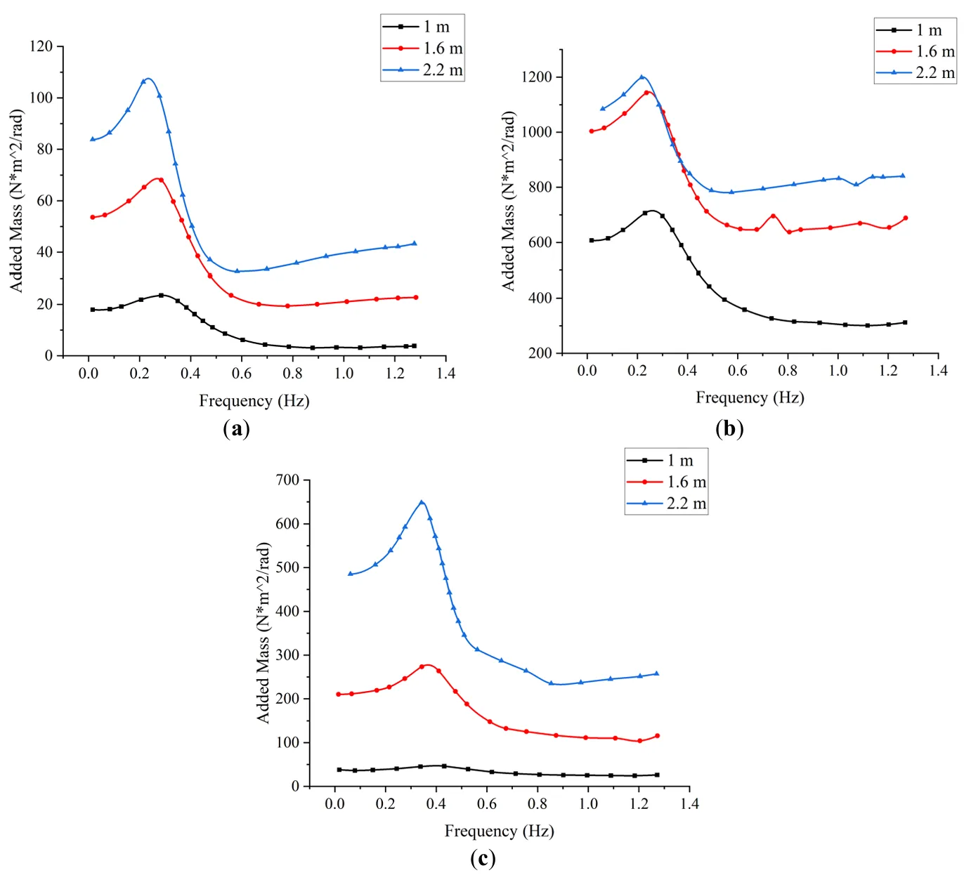 presents the frequency-dependent added mass for the three draft configurations. Across all directions, the added mass increases with wave frequency up to a peak value before declining. In pitch, the peak added mass occurs near 0.3 Hz, with values increasing proportionally with draft depth, again indicating stronger fluid-structure interaction at greater submergence. In the roll direction, peak added mass is also observed at approximately 0.3 Hz. However, the influence of draft becomes less pronounced at 1.6 m and 2.2 m, suggesting that roll-induced added mass becomes saturated or less sensitive beyond moderate submergence levels. For yaw, the added mass follows a similar frequency trend, peaking in the 0.2–0.4 Hz range. As draft depth increases, the amplitude of the yaw added mass also increases, indicating that yaw motion is more sensitive to submerged geometry in the lower-frequency range.