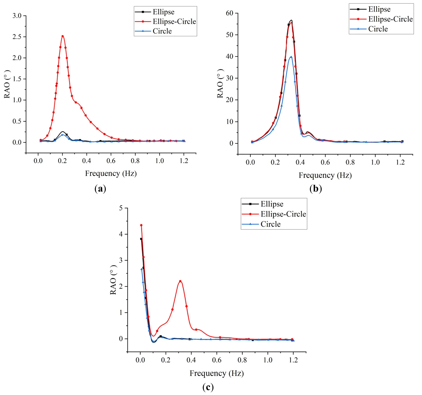 ) indicate that the elliptical-circular shape consistently achieves the highest response amplitudes, particularly in pitch, with peaks occurring around 0.3 Hz. Although symmetric models demonstrate similar RAOs in roll and yaw, the asymmetric design amplifies responses at low frequencies (0.2–0.4 Hz), suggesting improved resonance with incoming wave energy. At higher frequencies, RAOs for all models converge, indicating diminished shape influence.