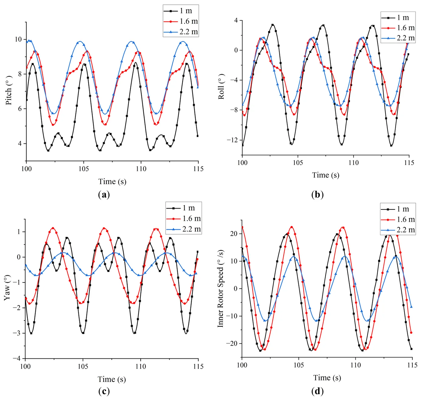 . Comparison of motion histories and inner rotor velocity for different draft depths. (<b>a</b>) Pitch (<b>b</b>) Roll (<b>c</b>) Yaw (<b>d</b>) Inner rotor velocity.