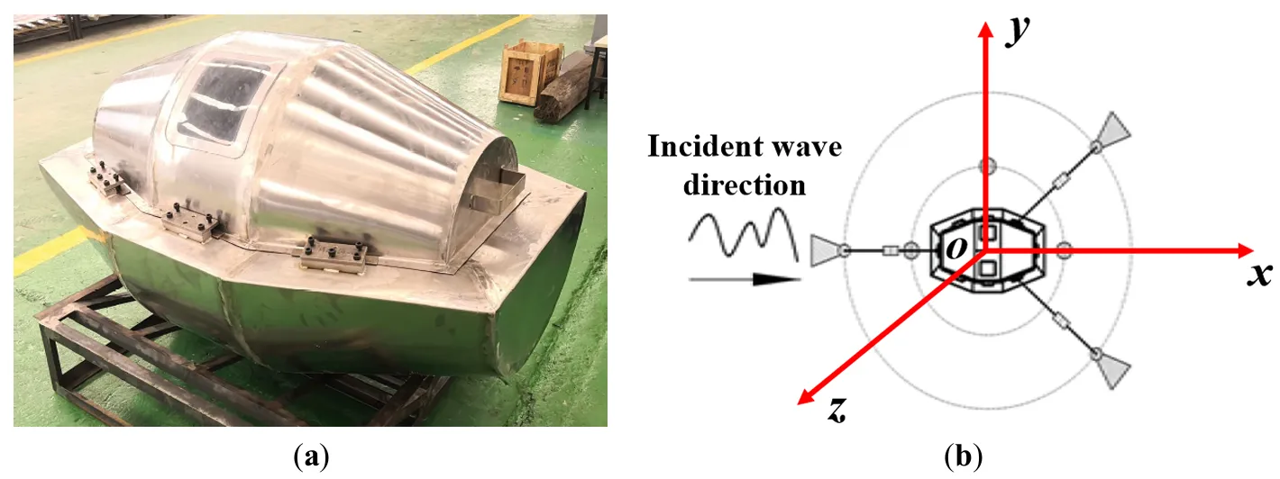 24]. The wave tank is rectangular, with a length of 30 m, a width of 4 m, and a depth of 3.5 m. Waves were generated using a low-inertia motor-driven wave paddle, capable of producing regular waves with heights ranging from 0.02 m to 1.0 m and periods between 1.5 s and 3.0 s. The physical prototype, shown in a, scaled at 1:5, has dimensions of 1.5 m (length) × 1.0 m (width) × 0.86 m (height) and a total mass of 210 kg. The draft of the floating body is 320 mm, with the center of buoyancy located 110 mm below the waterline and the center of gravity 60 mm above it. The device was moored using a three-point taut Kevlar rope system, with one end of each line fixed to the prototype and the other anchored to dead weights, as shown in b.