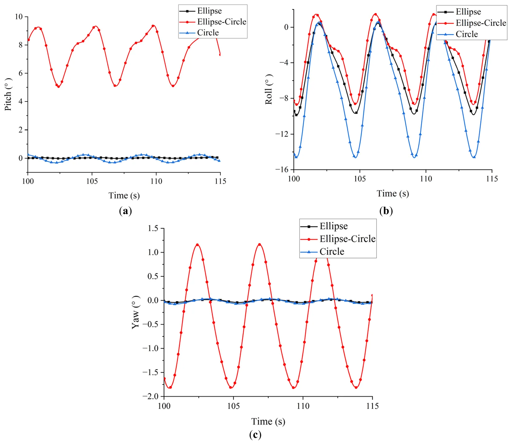 . Comparison of motion histories in three directions for different cross sections. (<b>a</b>) Pitch (<b>b</b>) Roll (<b>c</b>) Yaw.