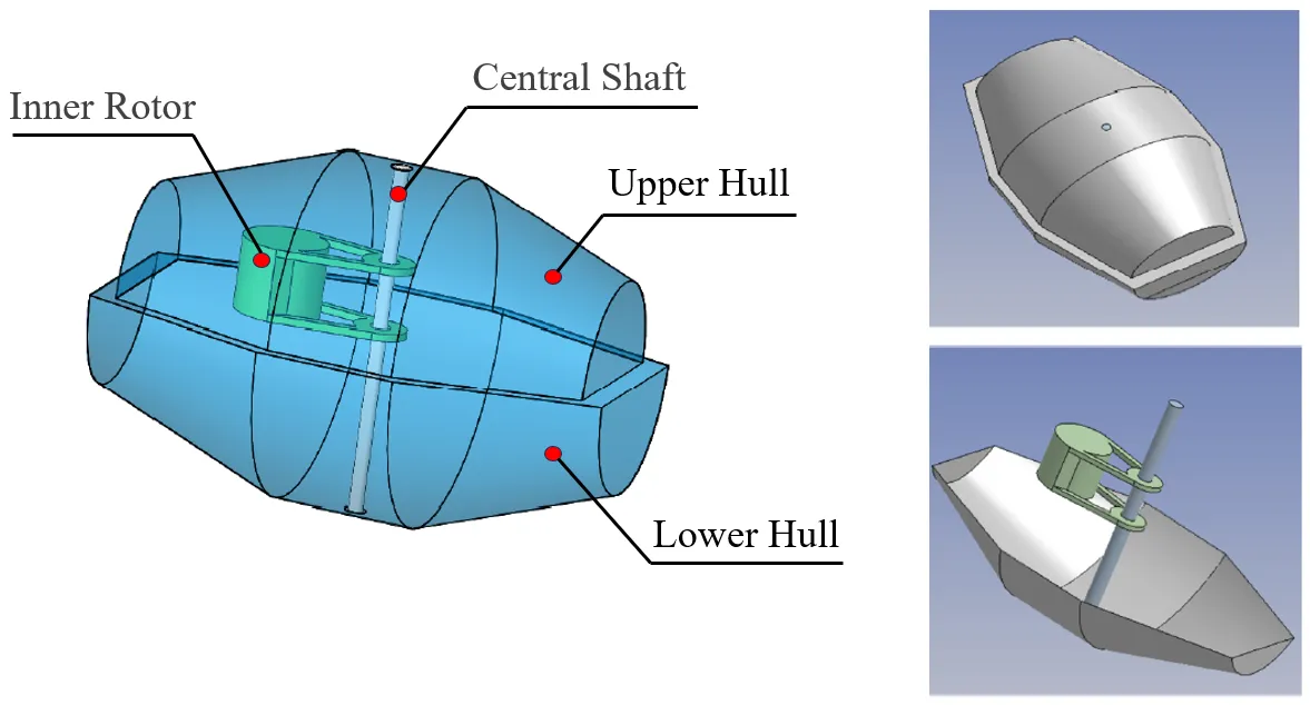 This section investigates the influence of main float cross-sectional geometry on the hydrodynamic behavior and energy capture performance of a floating inner-rotor WEC. The converter features a curved fore and aft structure designed to minimize vortex shedding and enhance energy absorption efficiency. Three distinct cross-sectional configurations of the main float were considered: ellipse type, ellipse-circle (asymmetric) type, and circle type, as illustrated in . While the elliptical and circular models exhibit symmetric geometry, the elliptical-circular model introduces asymmetry, which is hypothesized to improve wave energy capture. The structural dimensions for each configuration are summarized in , and the geometric and mass properties of the internal components—such as the hull, central shaft, and inner rotor—are listed in .