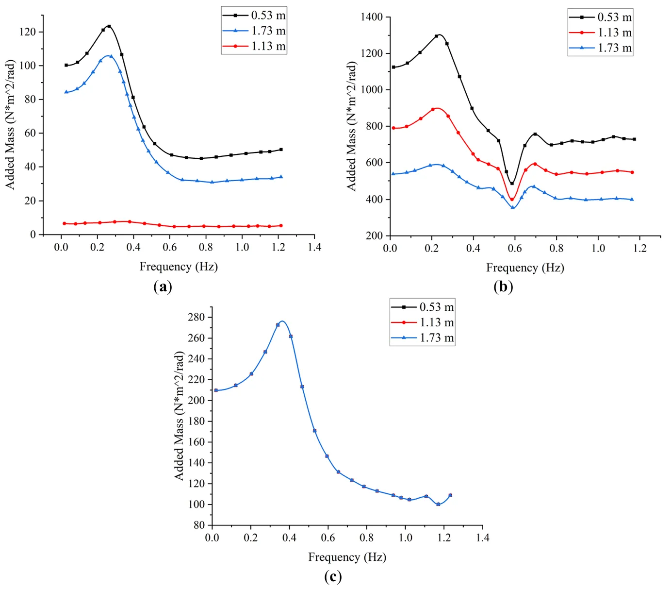 shows the variation in added mass with frequency for different CG positions. In all three motion directions, the added mass increases initially with frequency and then decreases, with peak values observed near 0.3 Hz. The influence of CG on added mass is most apparent in the pitch and roll directions, while it is negligible in yaw. In pitch, the CG at 1.13 m again yields the smallest variation, whereas the 0.53 m and 1.73 m cases demonstrate nearly identical behaviors, peaking in the 0.2–0.4 Hz range. In roll, the trend is consistent among all CG cases, but the amplitude decreases with increasing CG height. Peak values again occur in the 0.2–0.4 Hz range. For yaw, CG height has minimal impact, although peak added mass is observed within the same frequency band, likely due to the device’s natural frequency.