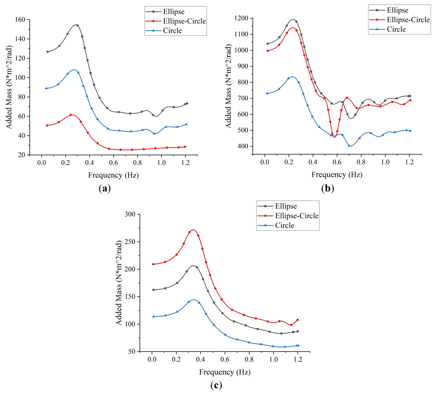 ) follow a similar trend, with peak values observed near 0.3 Hz. The symmetric configurations yield higher added mass in the pitch direction, while in roll, the elliptical-circular and elliptical shapes perform comparably. In yaw, the elliptical-circular model shows the greatest amplitude, peaking at 0.3–0.4 Hz, though absolute values remain modest.