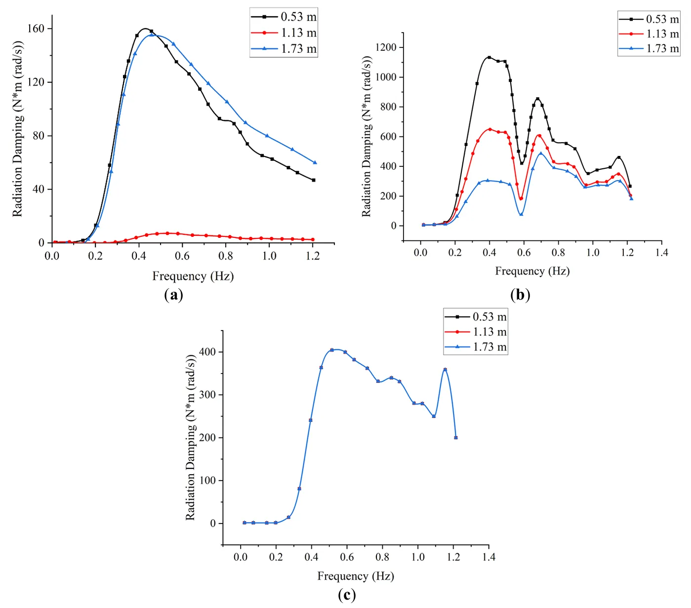 presents the radiation-damping coefficients of the device with varying CG positions as a function of wave frequency. Across the pitch, roll, and yaw directions, the radiation damping increases initially with frequency, reach a peak, and subsequently decreases. In the pitch direction, the case with CG at 1.13 m exhibits the smallest variation in radiation damping, while the cases with CG at 0.53 m and 1.73 m display nearly identical values and trends, peaking around 0.4 Hz. For roll, all three CG configurations follow a similar pattern. In the low-frequency range, increasing the CG height results in lower damping amplitudes. However, the influence of CG diminishes in the high-frequency range (beyond 0.6 Hz), though local fluctuations and secondary peaks are still observed. In the yaw direction, the CG position does not significantly affect the damping profile, though a pronounced peak appears between 0.4–0.6 Hz.