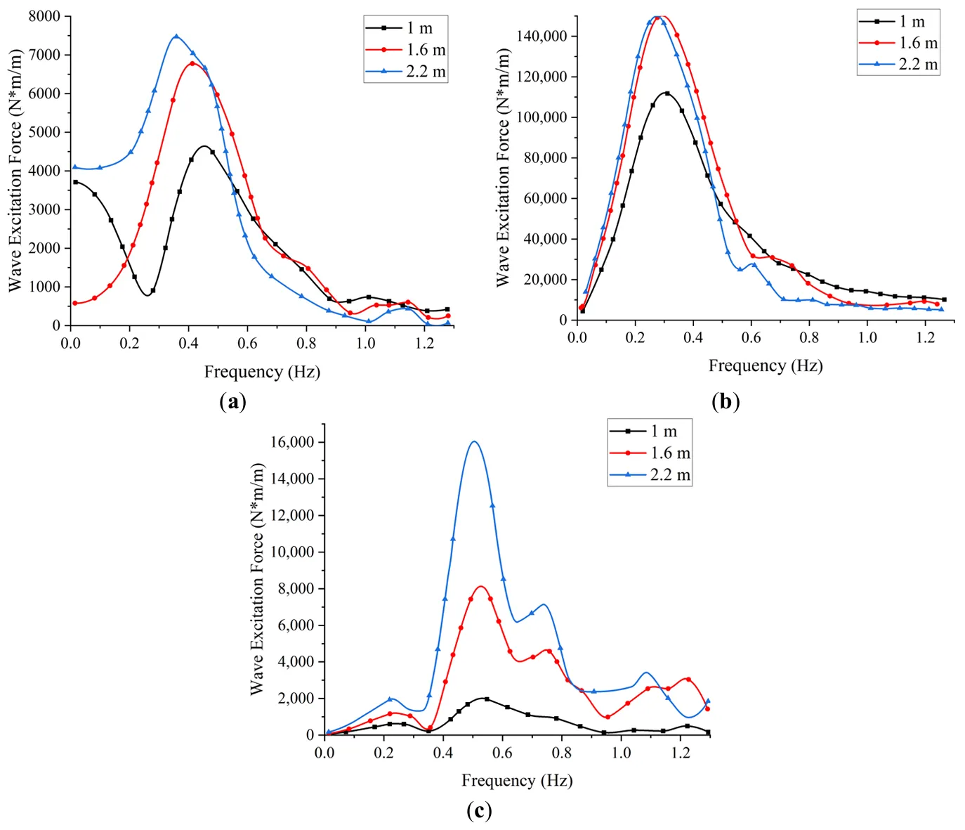The influence of draft depth on wave excitation forces is illustrated in . In all three rotational degrees of freedom, the excitation force shows a typical frequency response, increasing to a peak value before declining. The draft has the most pronounced effect in the yaw direction. In pitch, excitation forces peak between 0.3–0.5 Hz and increase with draft depth, particularly in the low-frequency range. However, at higher frequencies, the influence of the draft becomes minimal. In roll, the excitation force peaks at around 0.3 Hz. While the increase in the draft from 1.0 m to 1.6 m shows a slight effect, further increases to 2.2 m do not substantially alter the force, indicating a reduced sensitivity at greater draft depths. Yaw excitation forces peak at approximately 0.5 Hz and show a greater dependence on draft depth. As the draft increases, the variation in yaw excitation force becomes more substantial, suggesting that the yaw response is the most affected by changes in submerged volume.