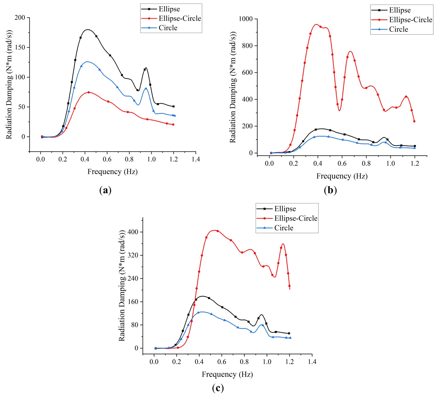 ) exhibits a general trend of increasing and then decreasing with frequency, peaking near 0.4 Hz. In the pitch direction, the symmetric elliptical and circular models show higher damping compared to the asymmetric elliptical-circular model. All three shapes reach peak damping within the 0.3–0.5 Hz range. In the roll direction, the elliptical-circular model demonstrates significantly higher damping, particularly at higher frequencies, indicating enhanced wave interaction due to geometric asymmetry. Yaw damping trends mirror those in roll, though the peak values are notably smaller.