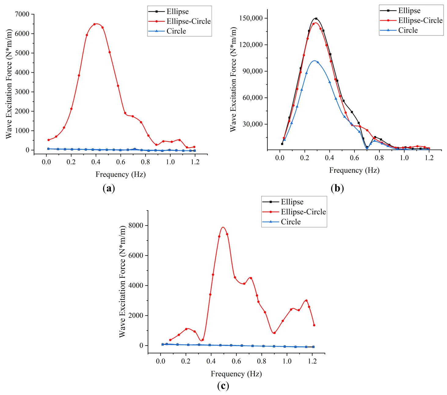 These results reveal that each hydrodynamic coefficient attains a maximum at specific wave frequencies. Overall, the asymmetric elliptical-circular configuration consistently yields the highest coefficients, confirming its enhanced capability for wave energy absorption. Notably, the most pronounced wave-structure interactions occur in the low-frequency band (0.2–0.4 Hz), which aligns well with typical ocean wave spectra, making this configuration particularly suitable for real-sea applications.