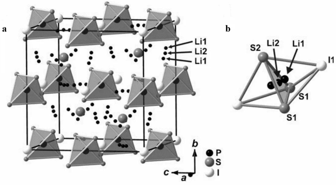 7], its structure is composed of 136 tetrahedrons formed by S atoms, P atoms fill four of the tetrahedral holes, I ions are located in the corners and faces of the unit cell, and lithium ions occupy part of the tetrahedral holes formed by S