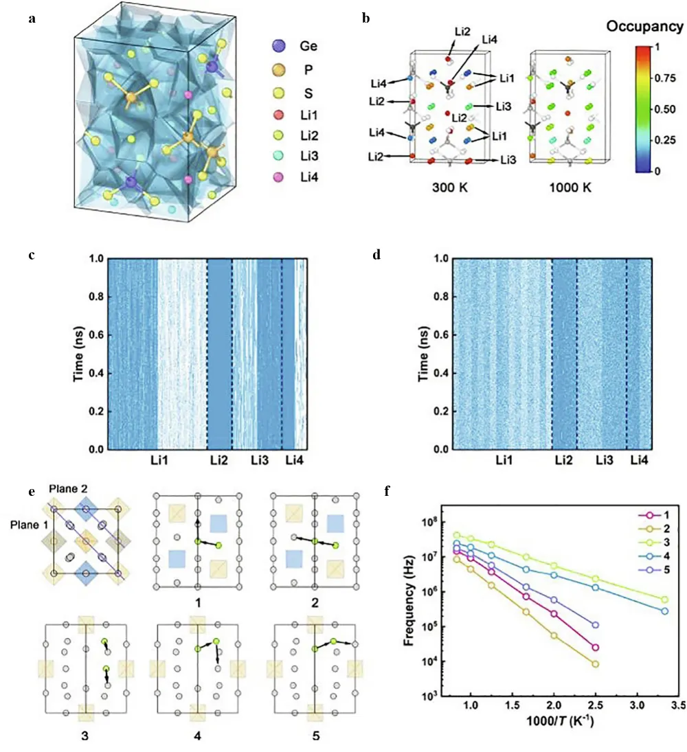 c). Neutron diffraction reveals lithium at these sites exhibits highly anisotropic thermal vibrations, displacing toward interstitial positions between 16h-16h and 16h-8f sites. This displacement directly evidences 1D ion migration along the c-axis. Partial occupancy (0.691(5) at 16h; 0.643(5) at 8f) reflects lithium’s average distribution along the pathway—a hallmark of superionic conductors. In addition to the above two categories, there are some special sulfide electrolyte structure types, such as thio-LISICON type, tetragonal LGPS type and argyrodite Li